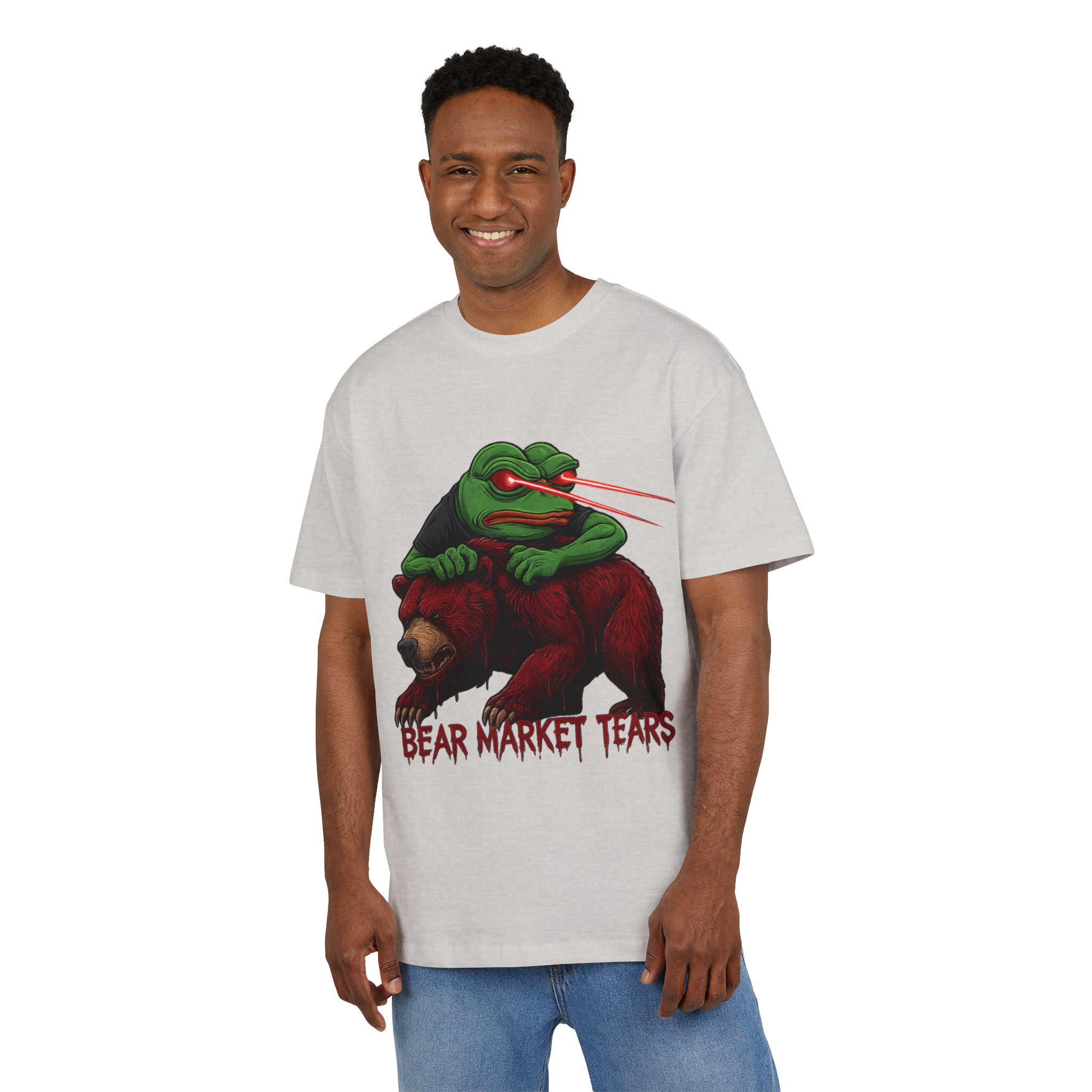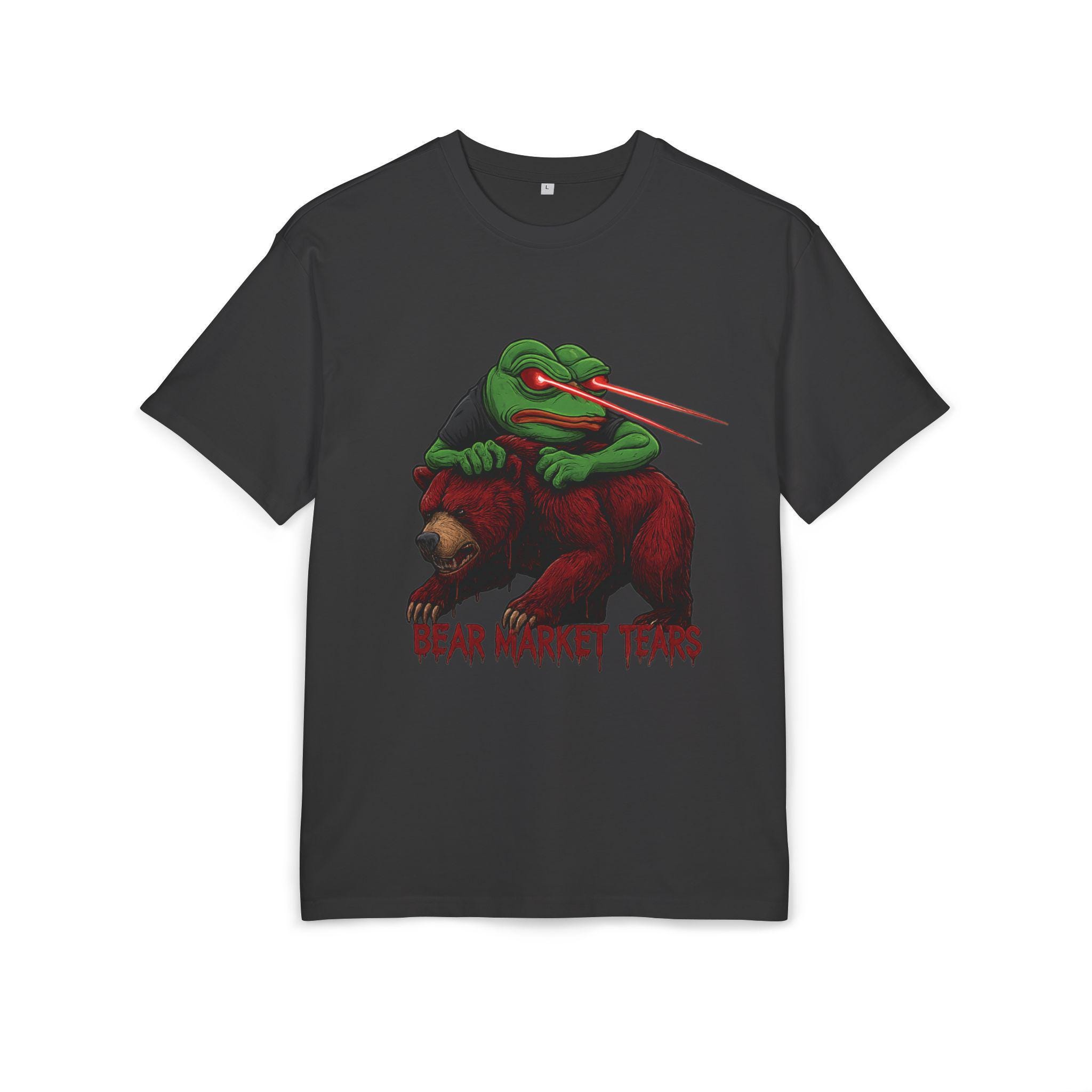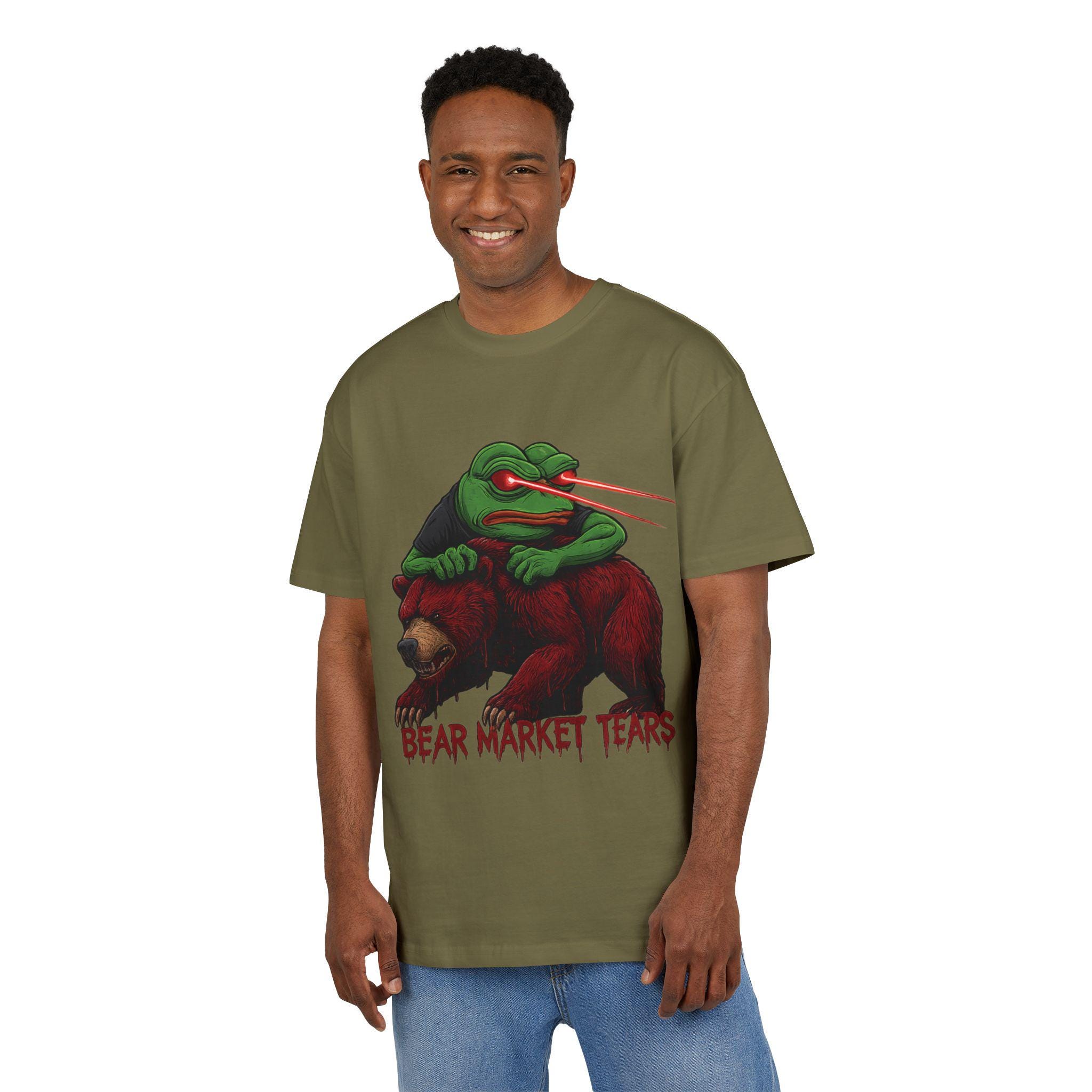 An oversized cotton tee that wears like a statement. The heavy 100% cotton body and dropped shoulders give it a lived-in, street-ready silhouette while the bold chest graphic — a fierce frog perched on a bear with laser eyes and distressed lettering — brings a dark, playful edge. Wear it when you want to lean into attitude: layered over long sleeves, paired with cargo pants, or thrown on after a late-night show. The heavyweight fabric holds print detail sharply and keeps the shape, while the crewneck and sewn-in labels add subtle quality cues. This shirt sits in the wardrobe where grit meets humor, made for people who like their style loud but comfortably oversized.