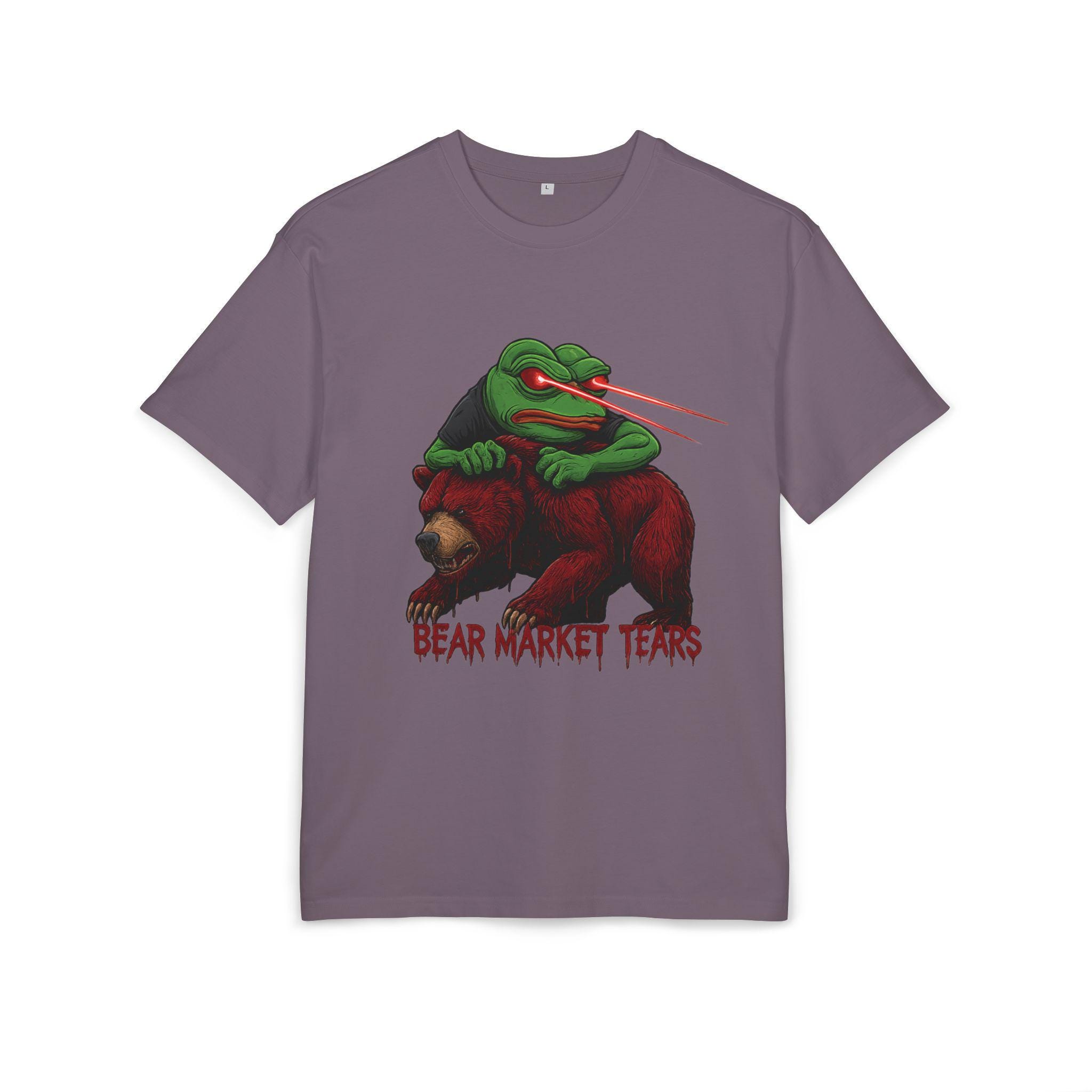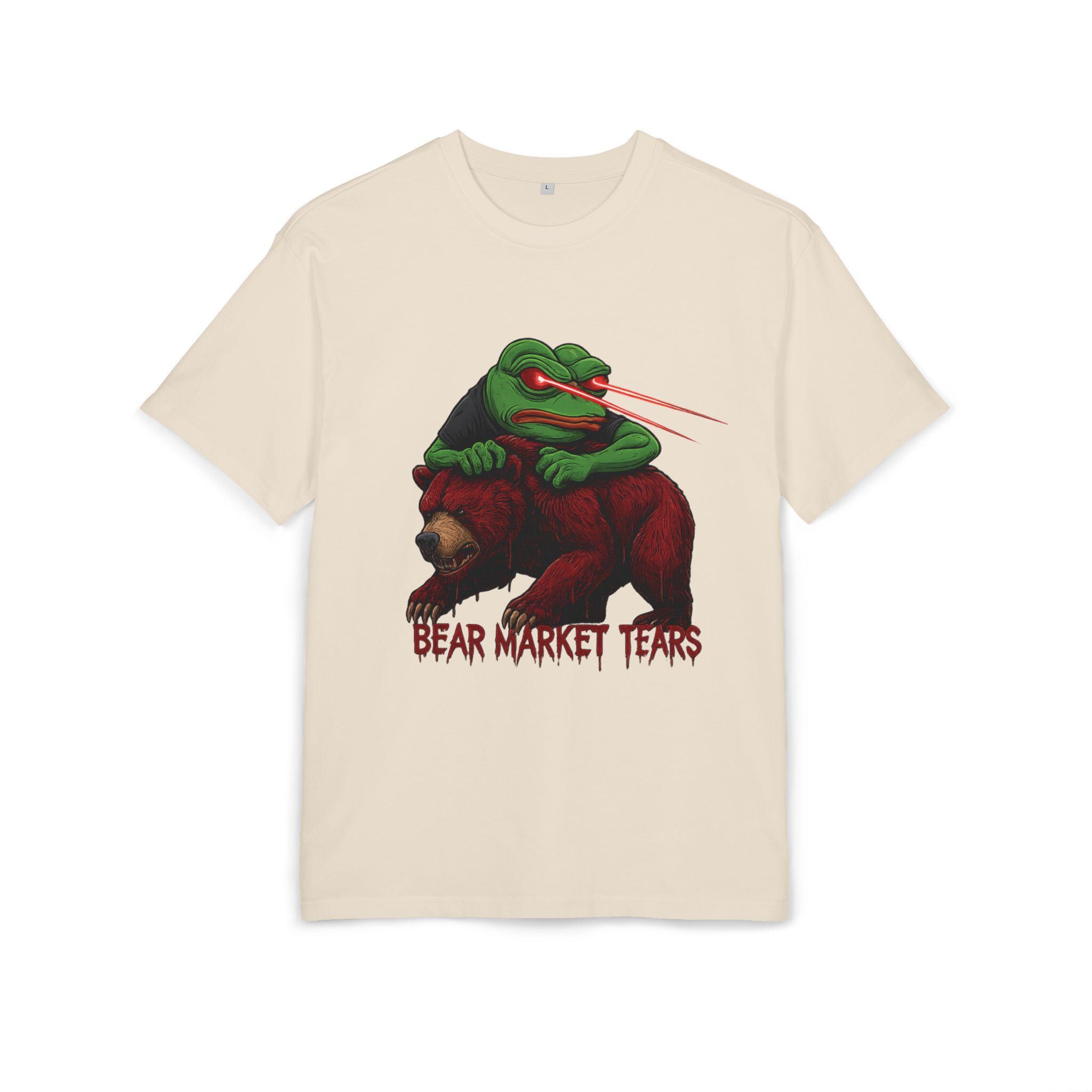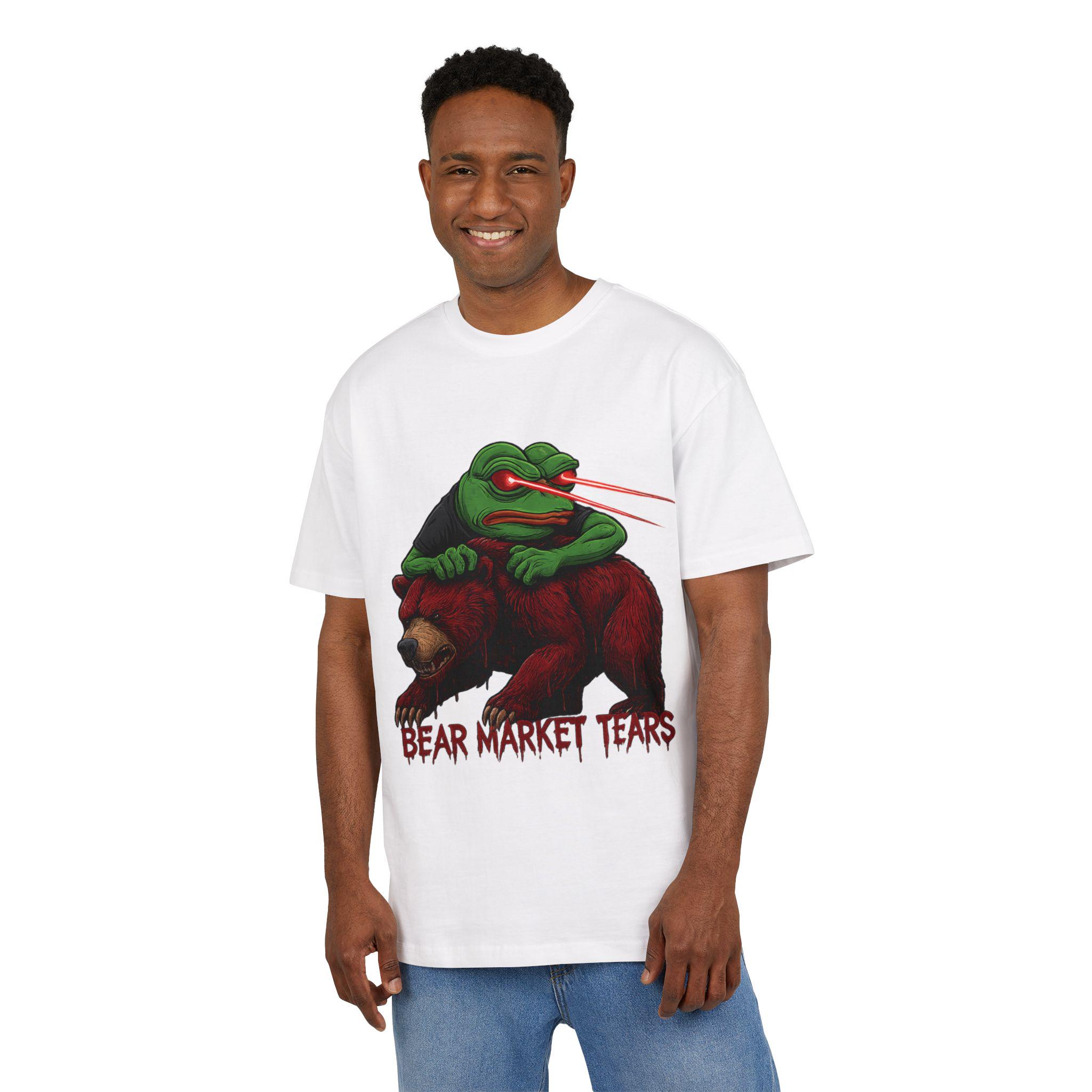 An oversized cotton tee that wears like a statement. The heavy 100% cotton body and dropped shoulders give it a lived-in, street-ready silhouette while the bold chest graphic — a fierce frog perched on a bear with laser eyes and distressed lettering — brings a dark, playful edge. Wear it when you want to lean into attitude: layered over long sleeves, paired with cargo pants, or thrown on after a late-night show. The heavyweight fabric holds print detail sharply and keeps the shape, while the crewneck and sewn-in labels add subtle quality cues. This shirt sits in the wardrobe where grit meets humor, made for people who like their style loud but comfortably oversized.