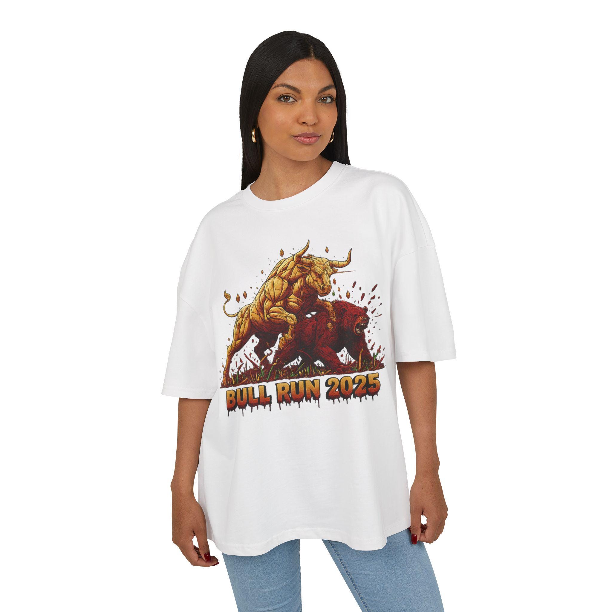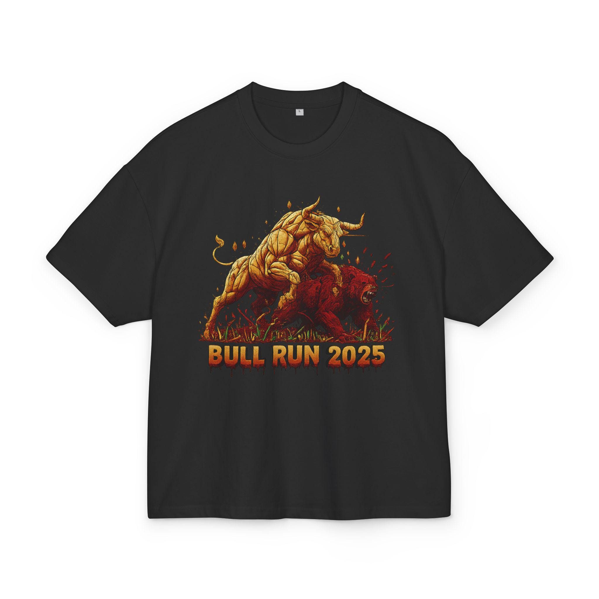 This oversized box tee brings stadium energy to everyday wear. The heavy-weight cotton holds bold prints brilliantly, so the charging bull artwork pops with every step. It drapes with a relaxed, cropped silhouette and dropped shoulders that read casual but deliberate—great for layering under a jacket or wearing solo with high-waisted jeans. The crew neck stays neat wash after wash, while the sturdy fabric and sewn-in labels mean this shirt will be part of your rotation for seasons to come. Wear it when you want to feel grounded, loud, and ready to move forward.