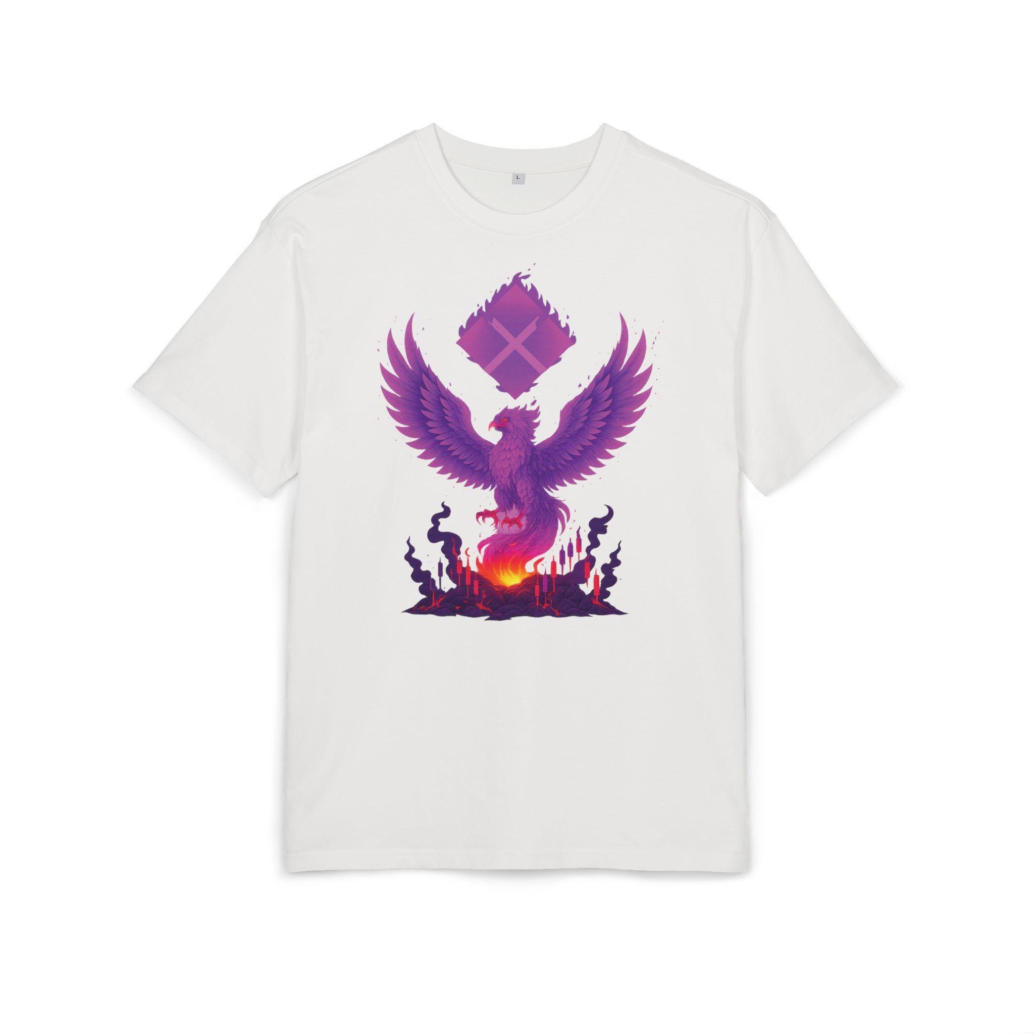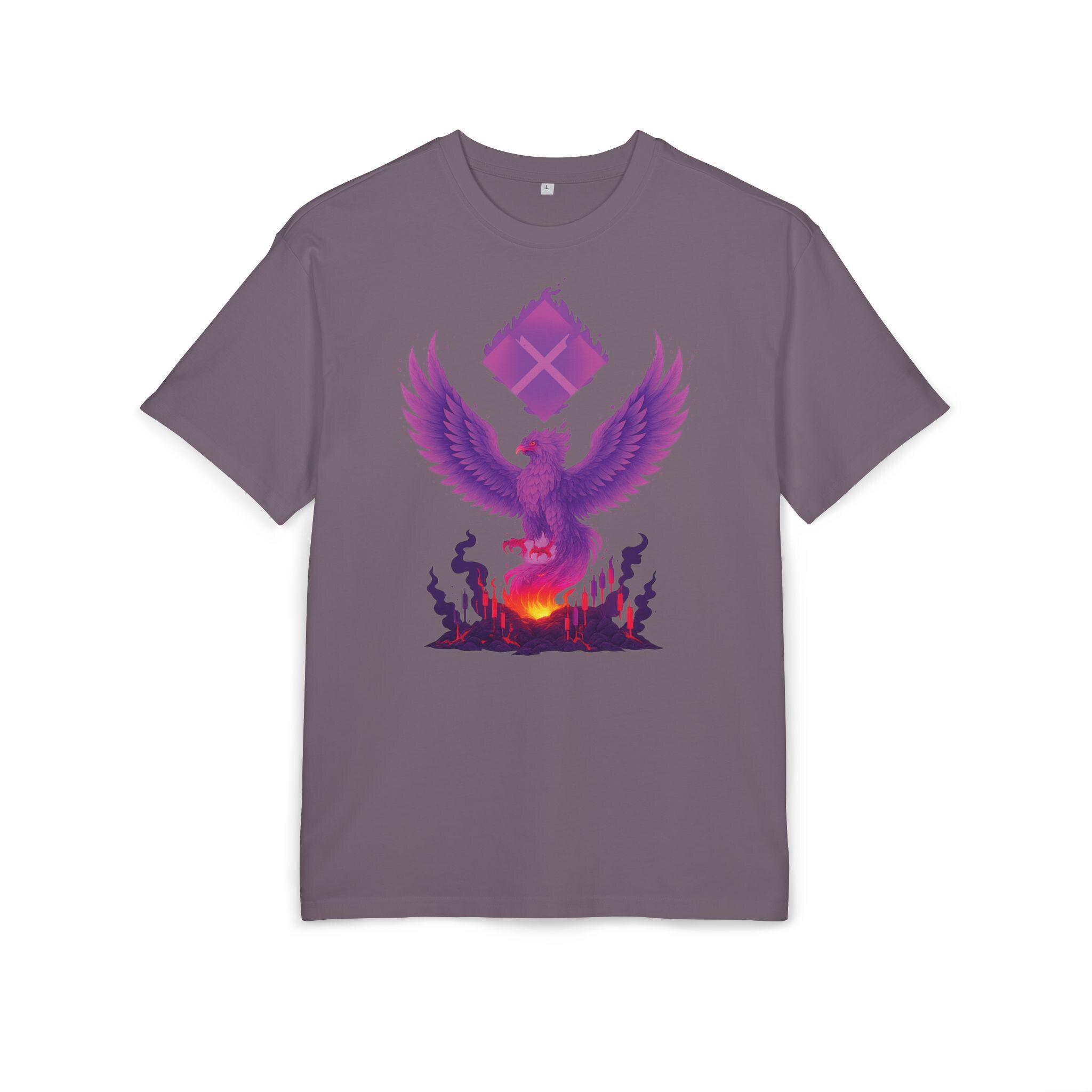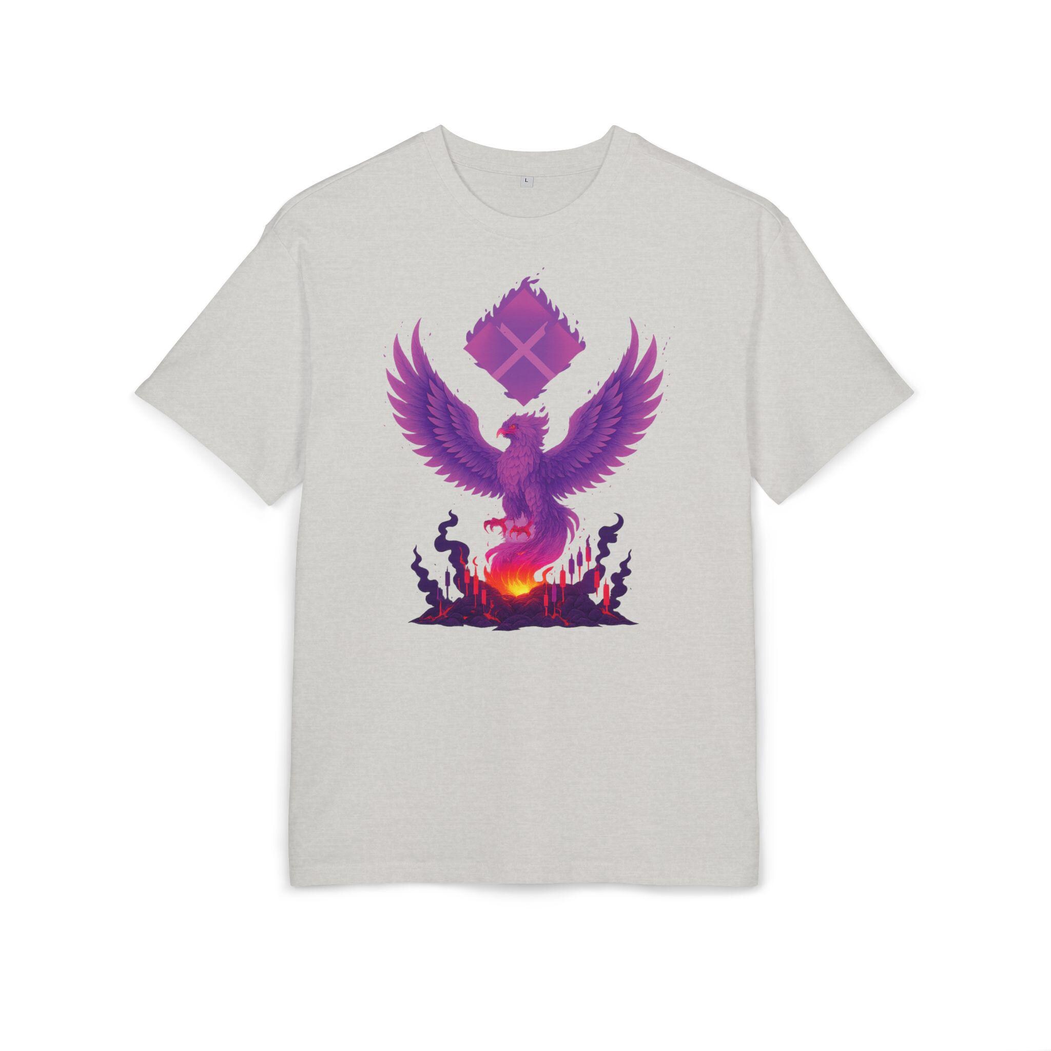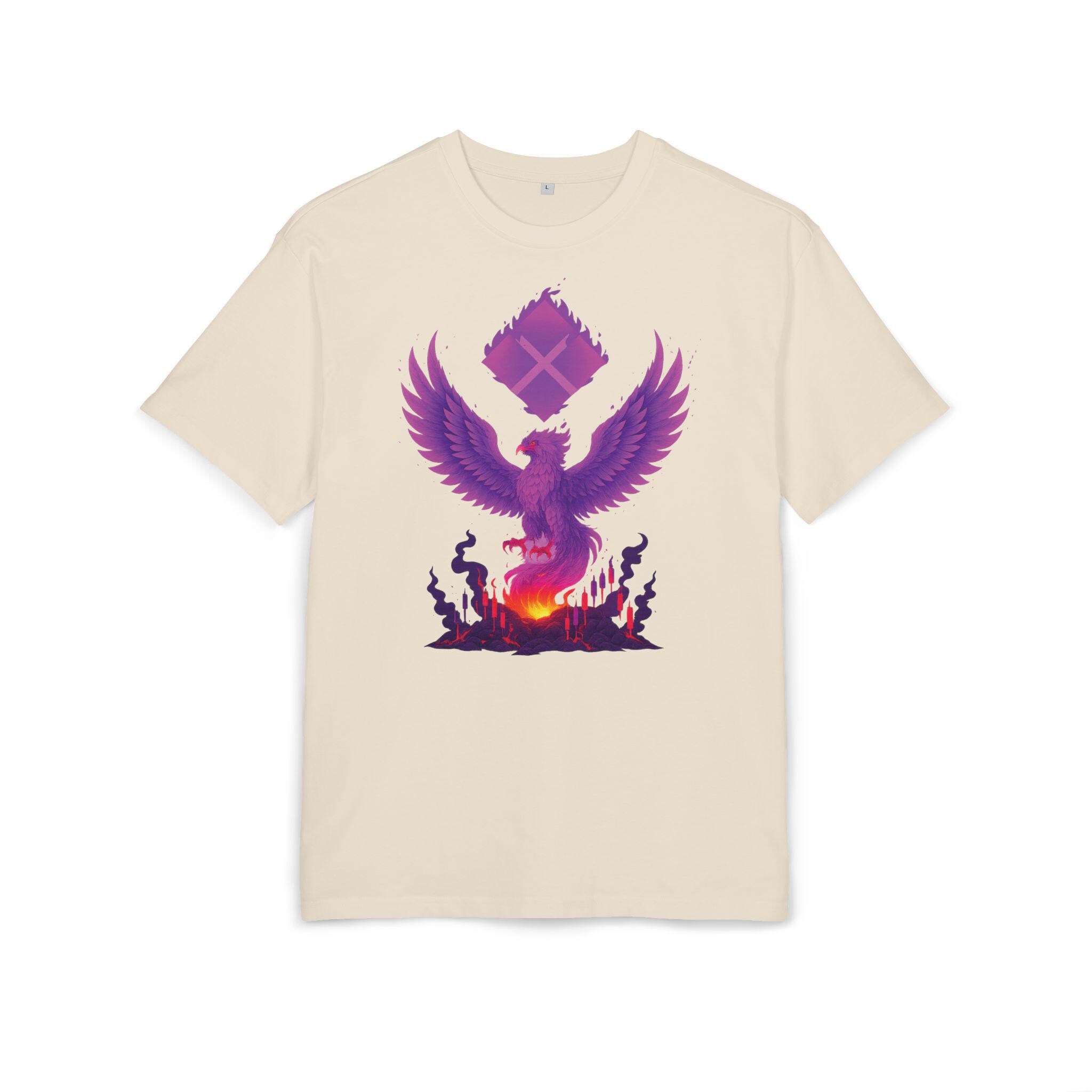 A bold, oversized tee that carries an ember-lit story across its chest. Soft yet substantial 100% cotton holds a vivid, painterly phoenix rising from glowing coals — deep purples melting into molten orange. The wide cut and dropped shoulders give a relaxed silhouette that drapes like a favorite jacket, while heavy-weight fabric keeps the print looking crisp and the tee feeling sturdy through repeated wear. Wear it to ground an outfit, to speak quietly about rebirth and resilience, or to bring warmth to cooler evenings when you want something roomy and reassuring.