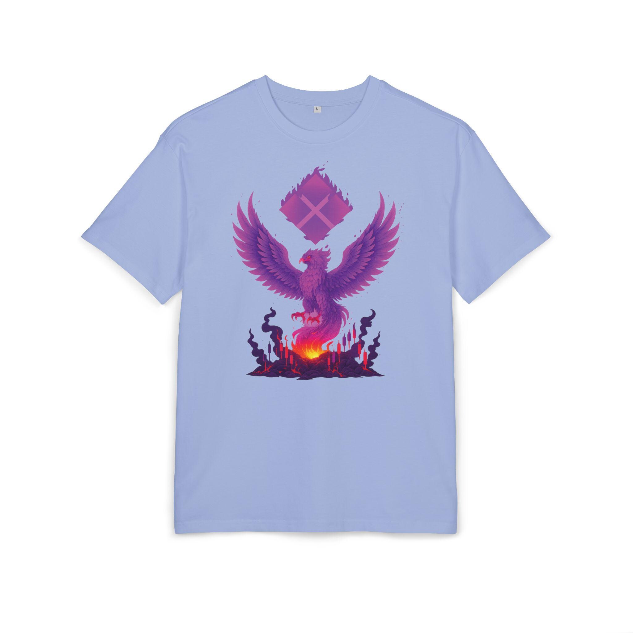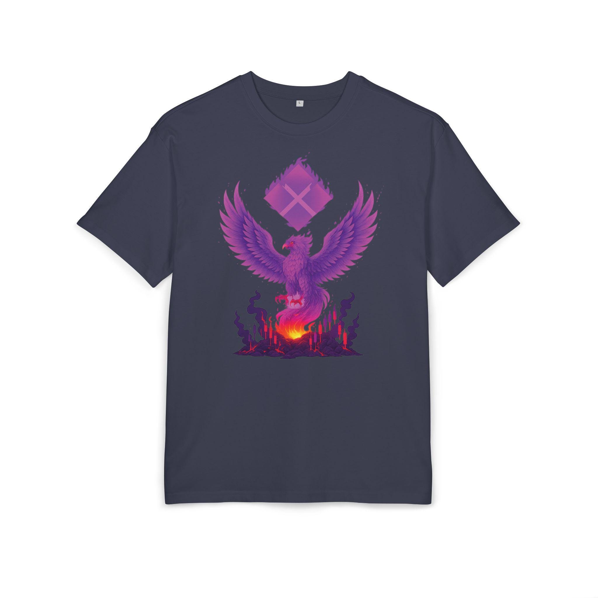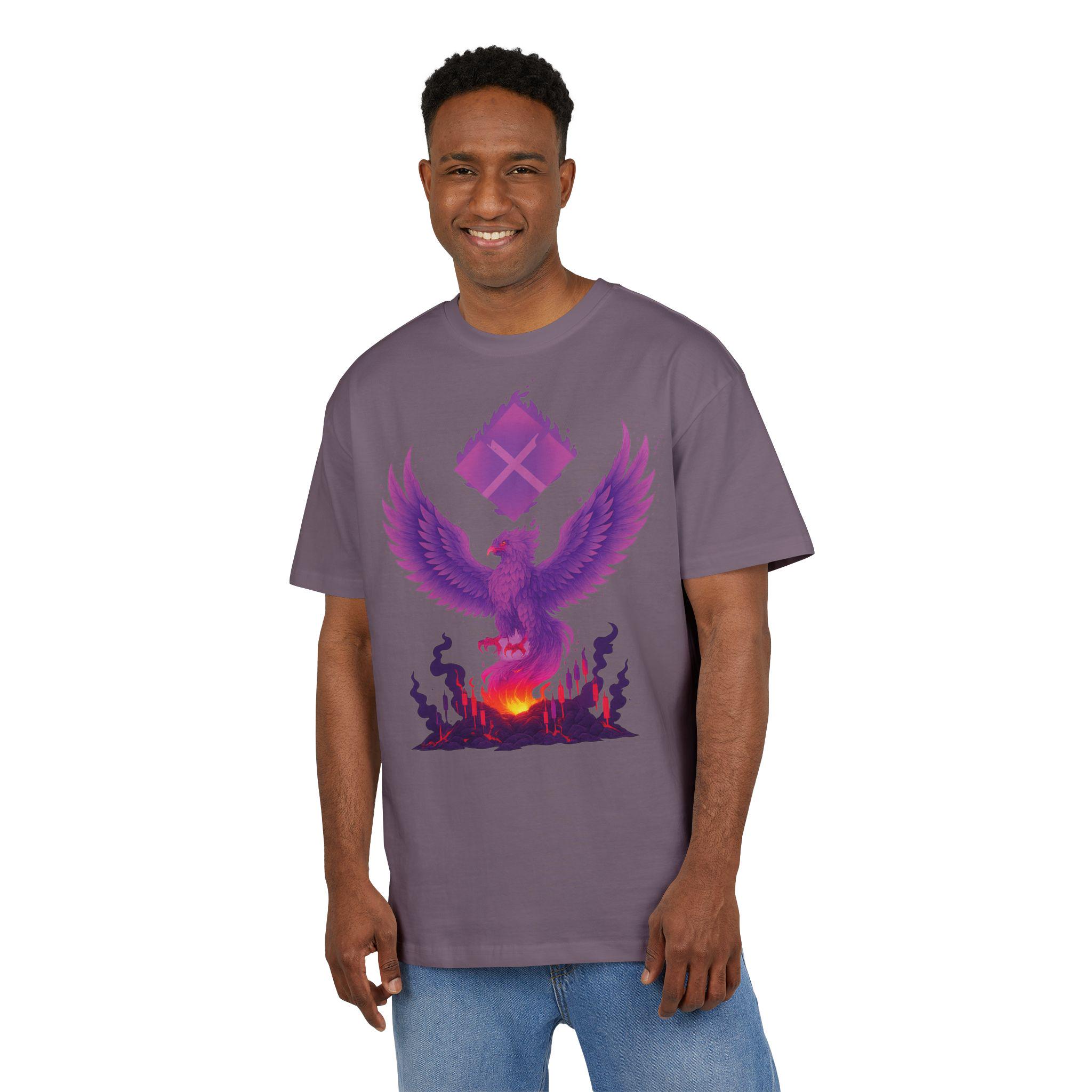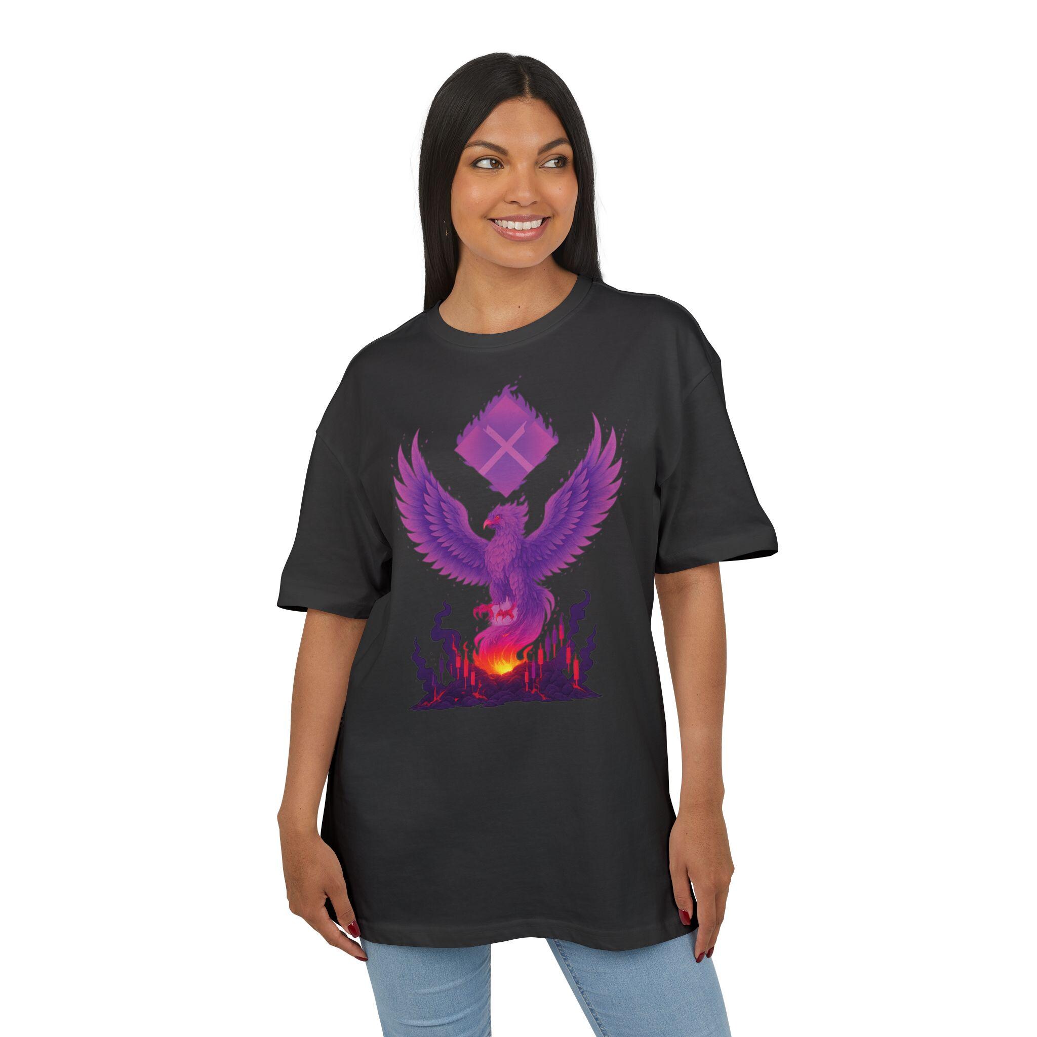 A bold, oversized tee that carries an ember-lit story across its chest. Soft yet substantial 100% cotton holds a vivid, painterly phoenix rising from glowing coals — deep purples melting into molten orange. The wide cut and dropped shoulders give a relaxed silhouette that drapes like a favorite jacket, while heavy-weight fabric keeps the print looking crisp and the tee feeling sturdy through repeated wear. Wear it to ground an outfit, to speak quietly about rebirth and resilience, or to bring warmth to cooler evenings when you want something roomy and reassuring.