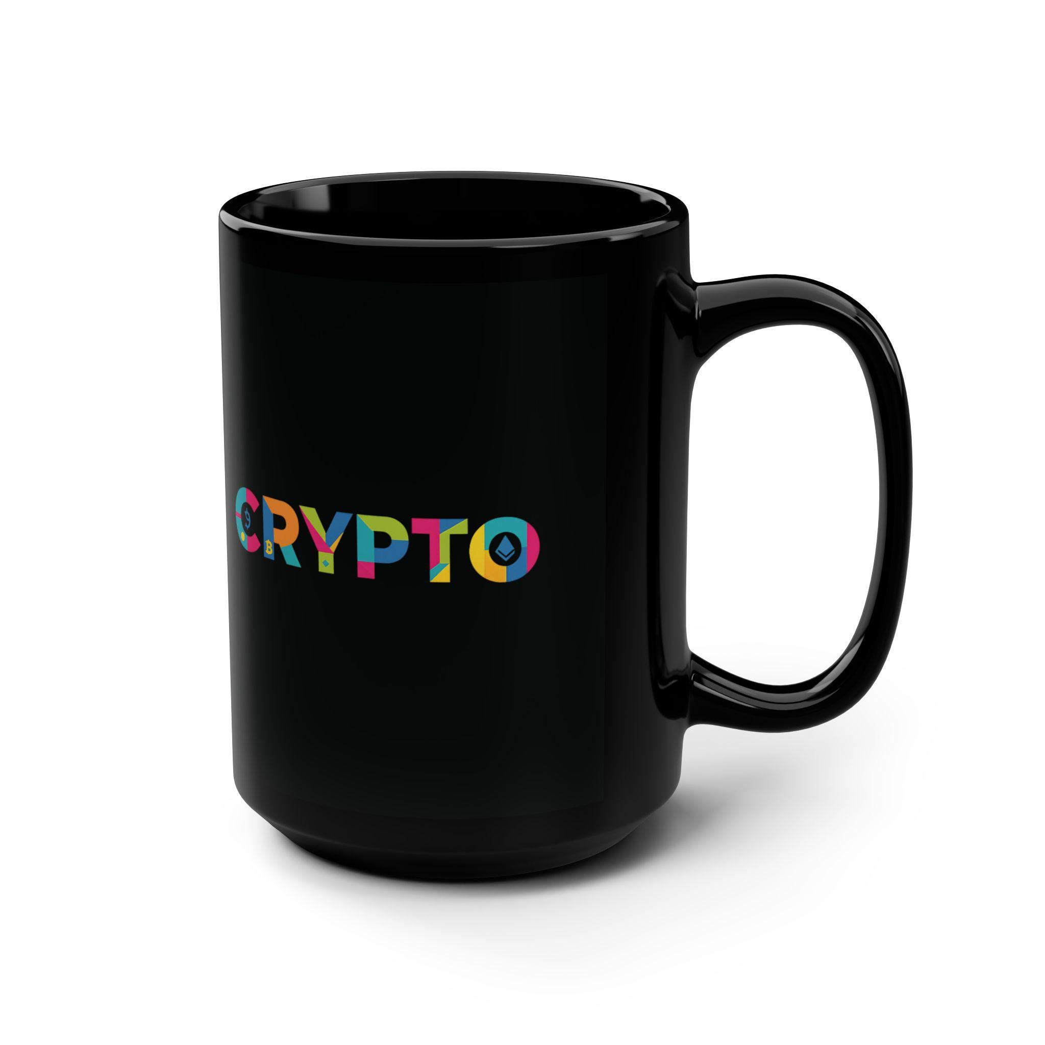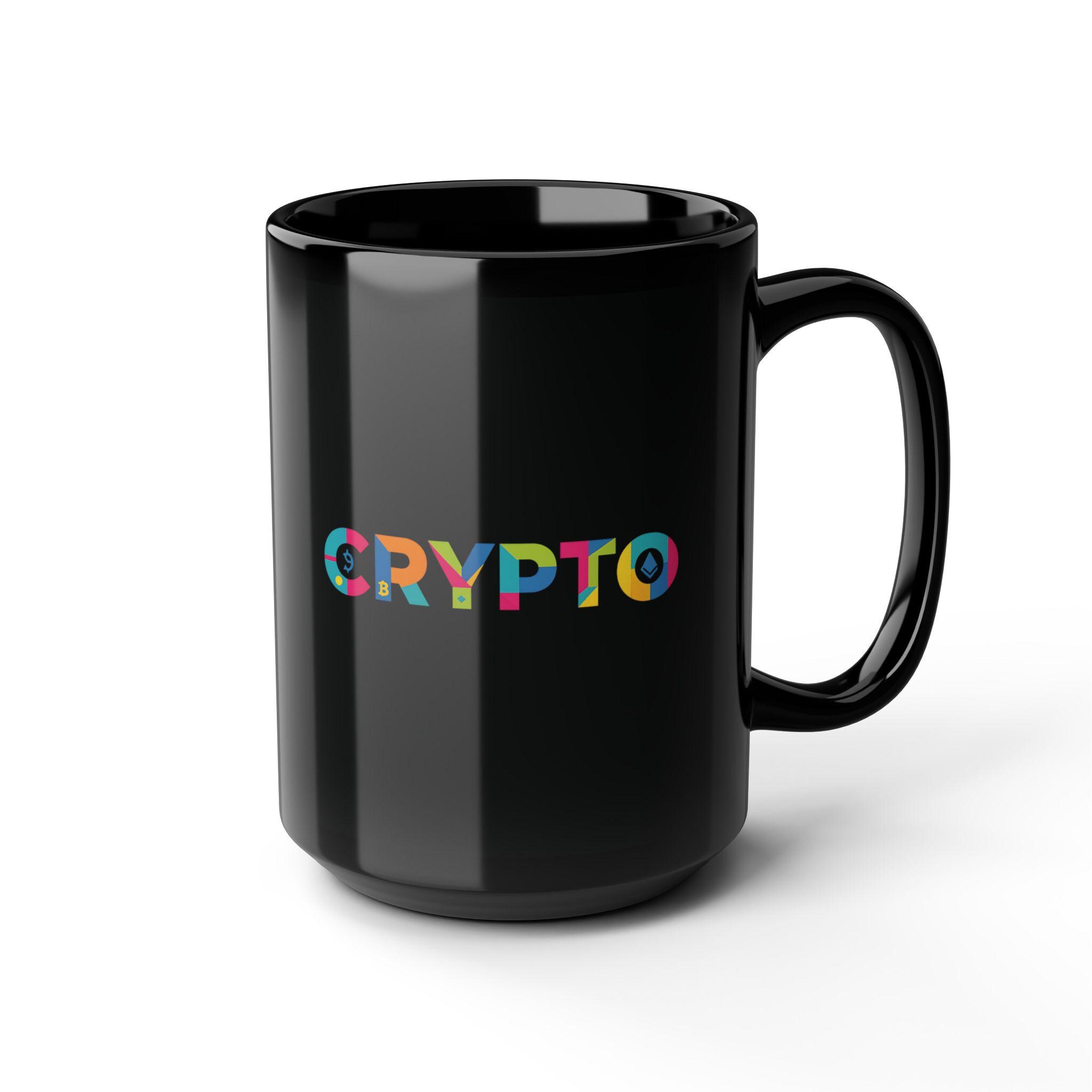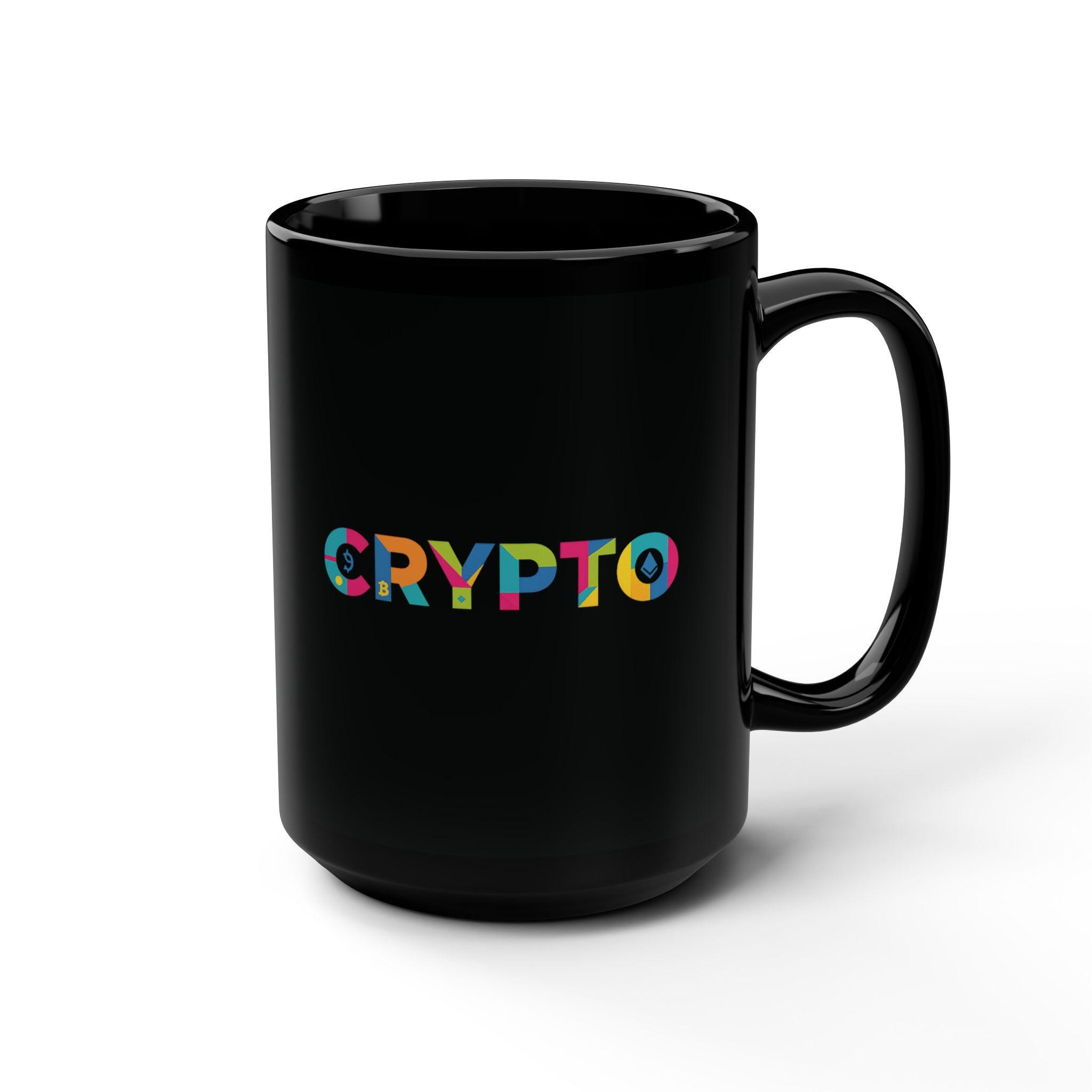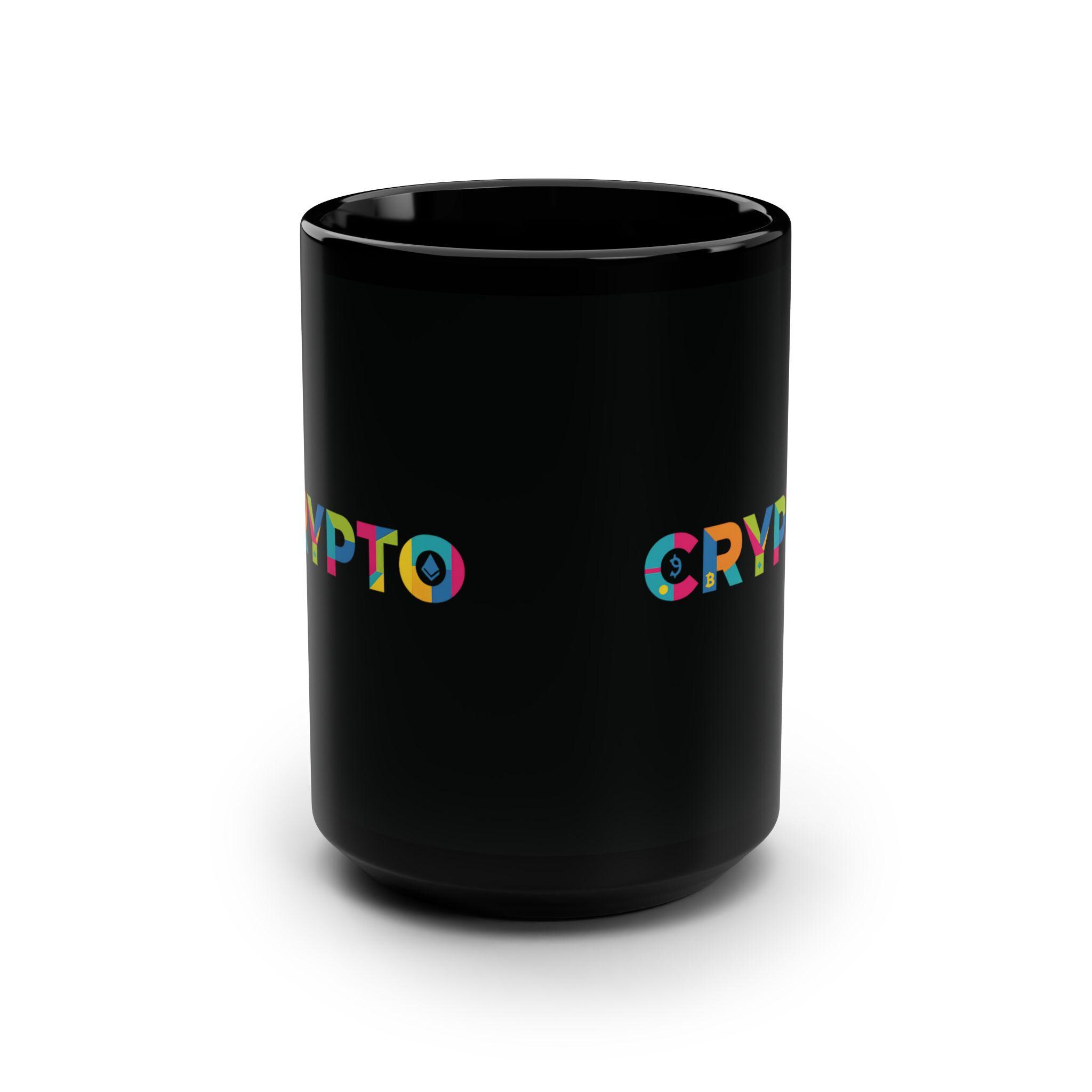 Black 15oz ceramic mug with a vibrant, multicolor “CRYPTO” design that pops against a glossy black backdrop. It holds a generous pour for long work sessions or relaxed mornings, while the comfortable C-shaped handle keeps your grip steady. The bold typography and bright palette add a playful, tech-forward edge to a simple daily ritual. Bring this mug to a home office desk, a late-night coding session, or a weekend crypto meet-up — it’s a small, everyday reminder of the community and curiosity that fuel the space.