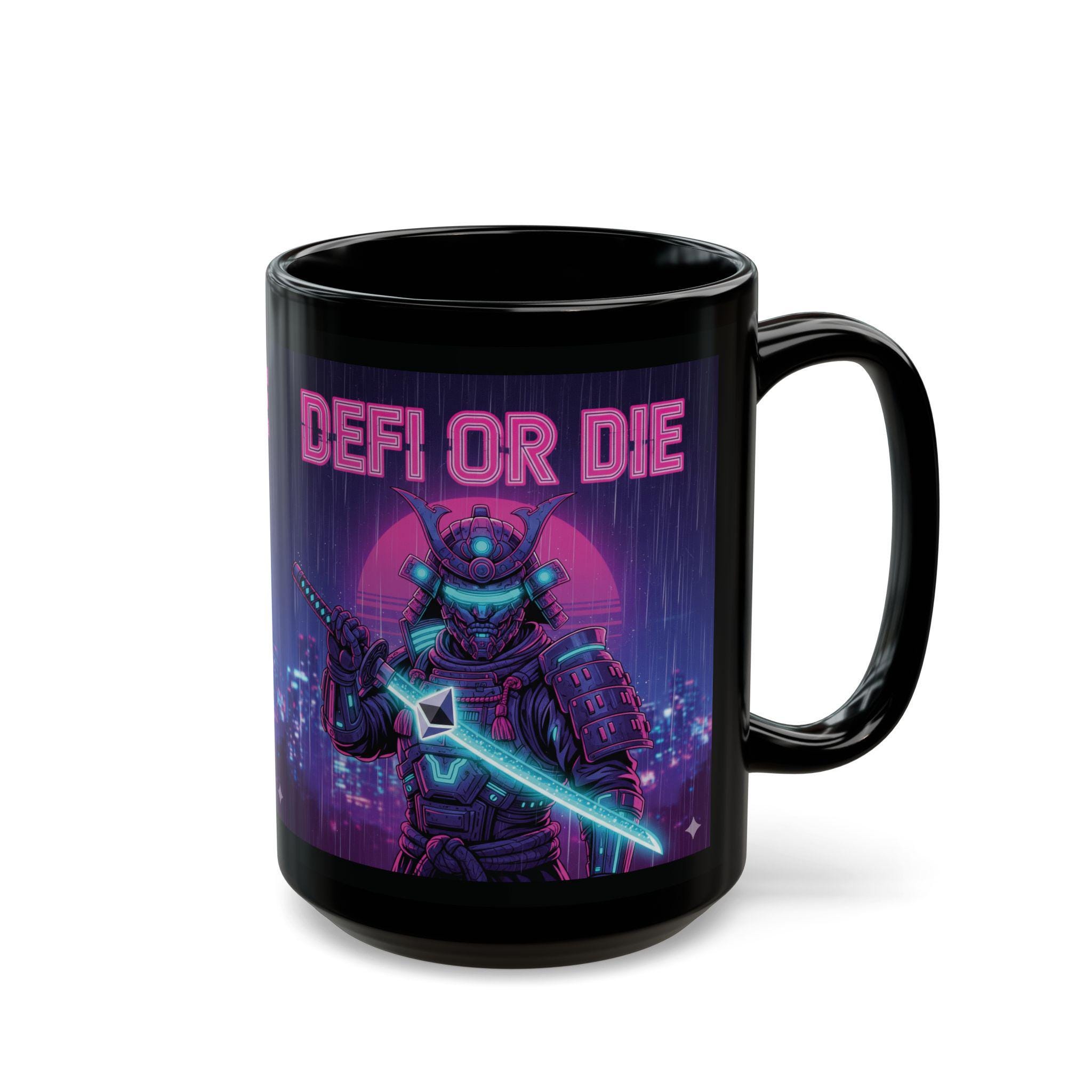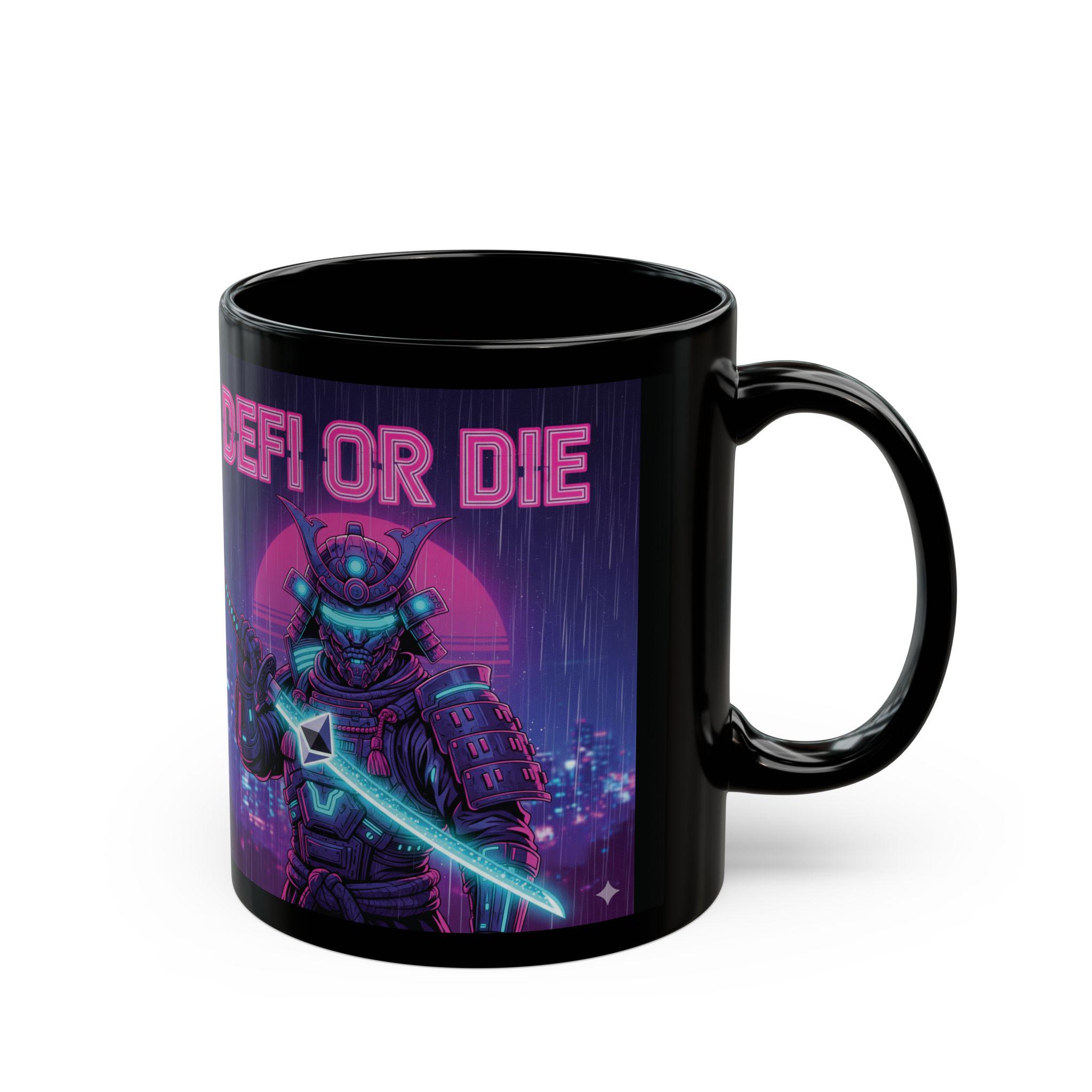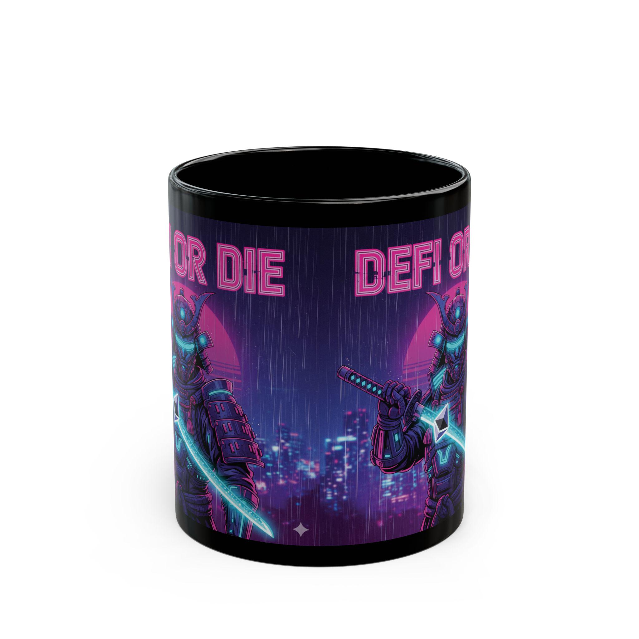 Sip your coffee with neon-soaked swagger. This glossy black mug features a cyber-samurai illustration in electric blues and hot pinks, set against a rainy, retro-futuristic cityscape and bold "DEFI OR DIE" lettering. The design wraps around the mug so the scene reads whether you’re left- or right-handed. It feels like a midnight alley in pixelated Tokyo — gritty, bright, and unapologetically bold. Bring it to late-night coding sessions, weekend vinyl spins, or morning routines when you need a short, fierce jolt of attitude.