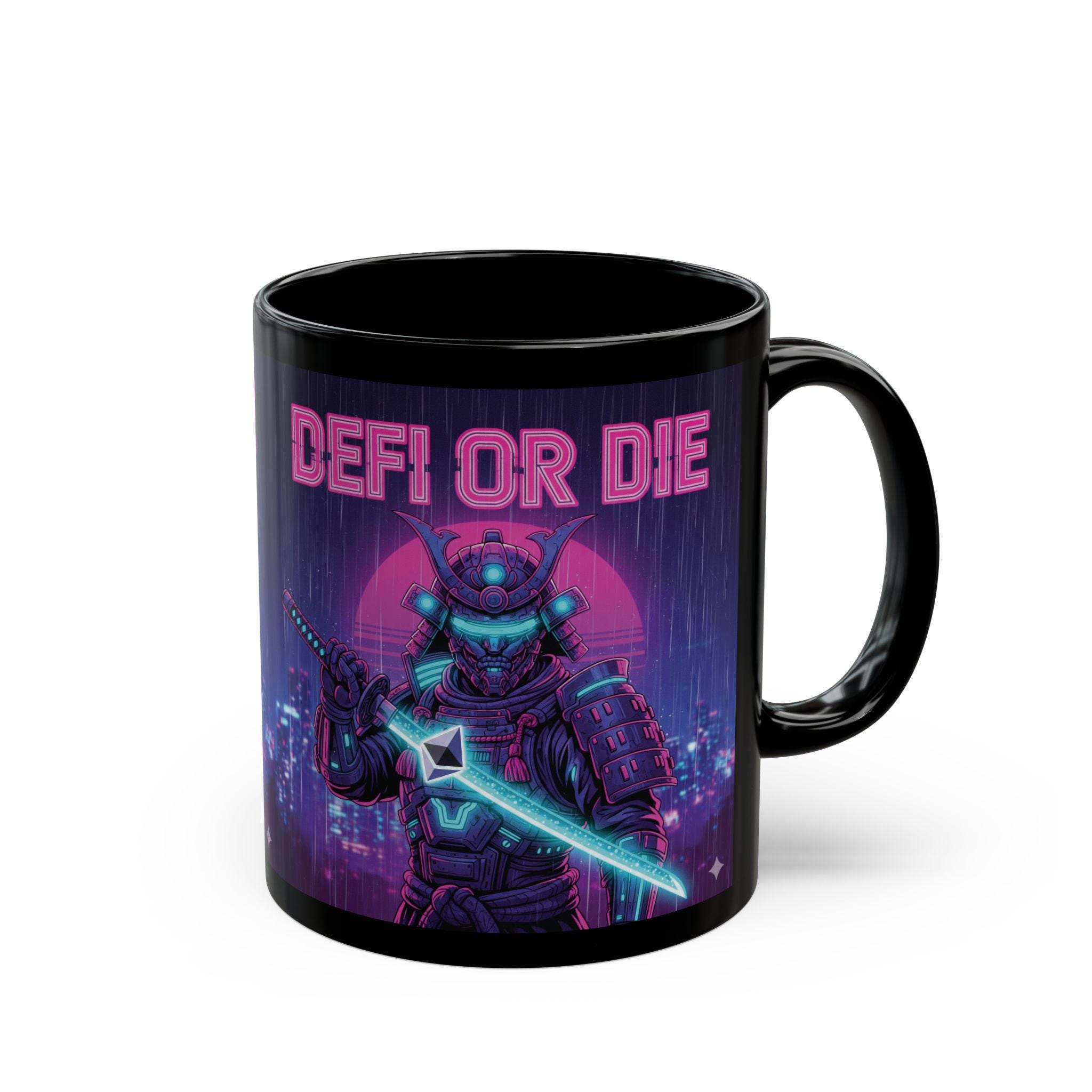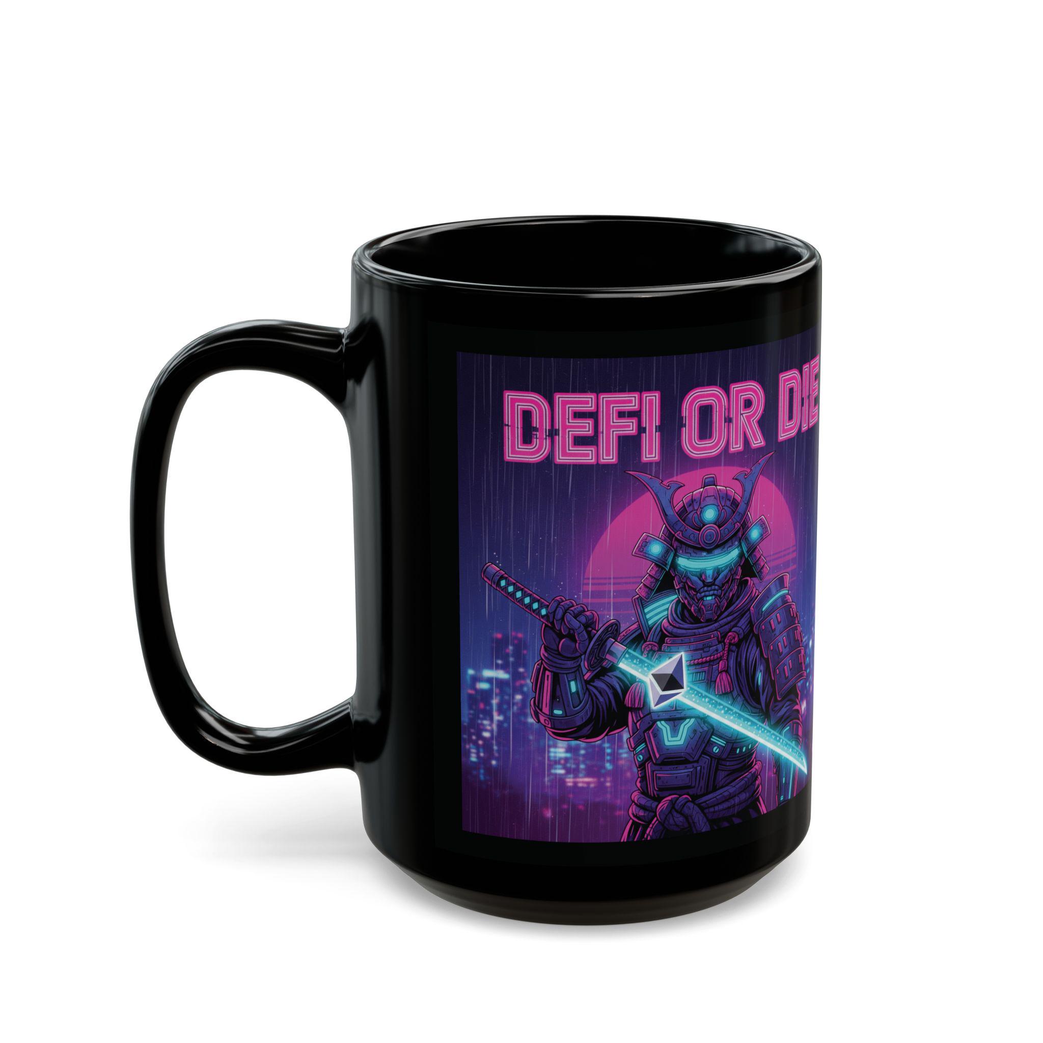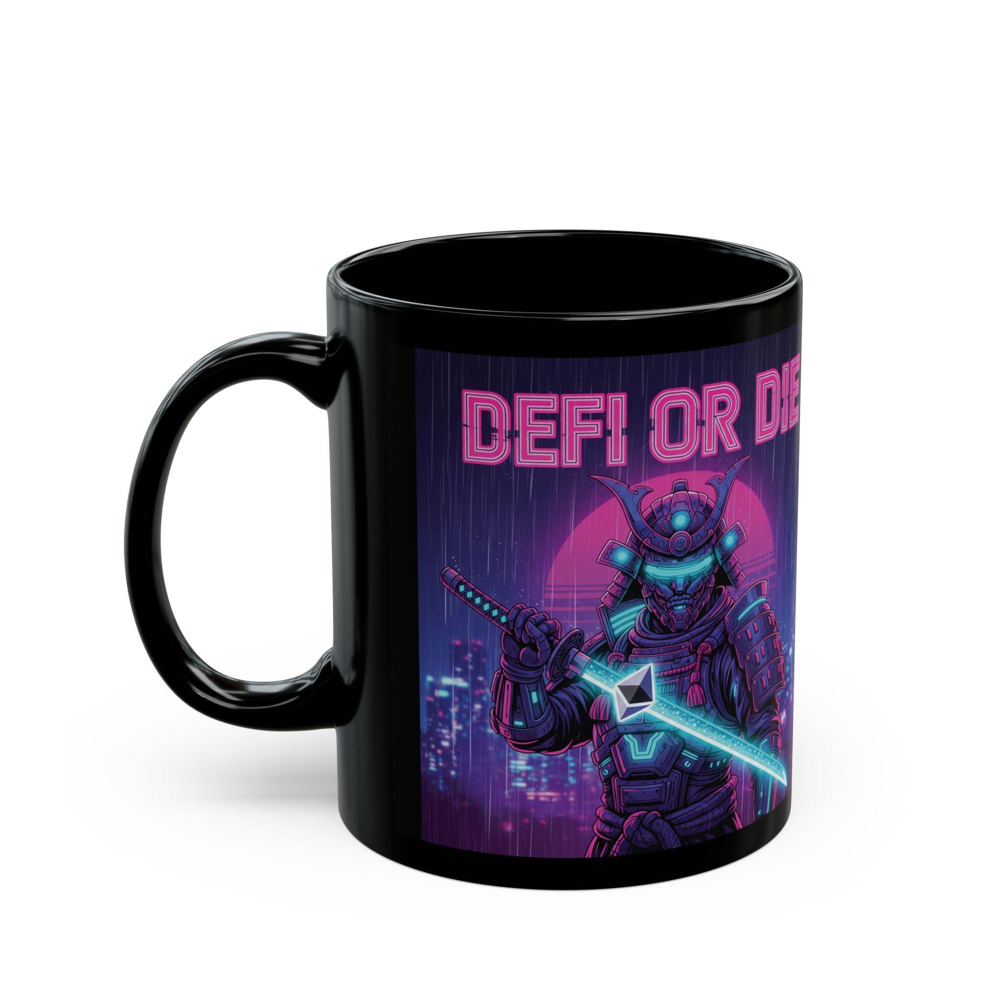 Sip your coffee with neon-soaked swagger. This glossy black mug features a cyber-samurai illustration in electric blues and hot pinks, set against a rainy, retro-futuristic cityscape and bold "DEFI OR DIE" lettering. The design wraps around the mug so the scene reads whether you’re left- or right-handed. It feels like a midnight alley in pixelated Tokyo — gritty, bright, and unapologetically bold. Bring it to late-night coding sessions, weekend vinyl spins, or morning routines when you need a short, fierce jolt of attitude.
