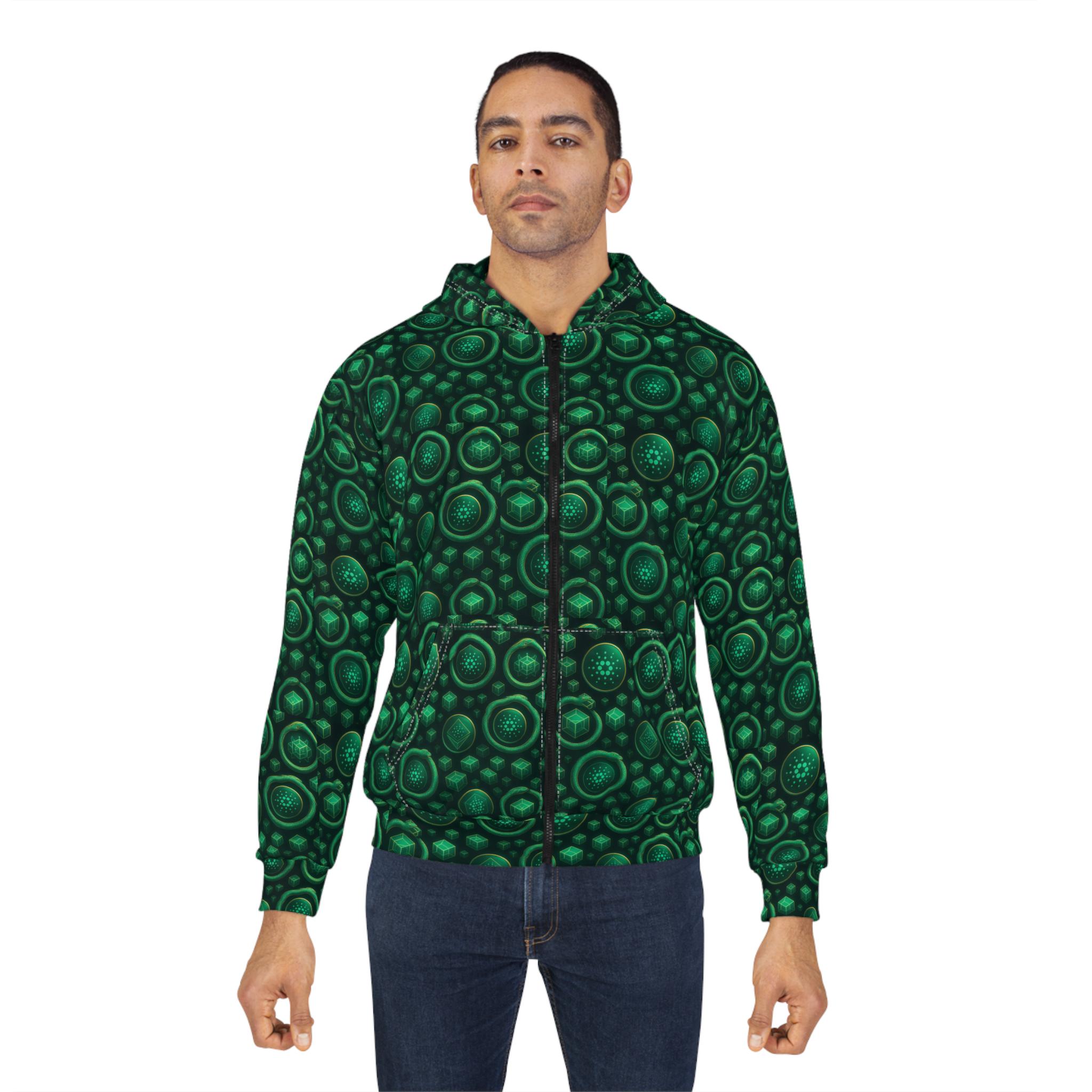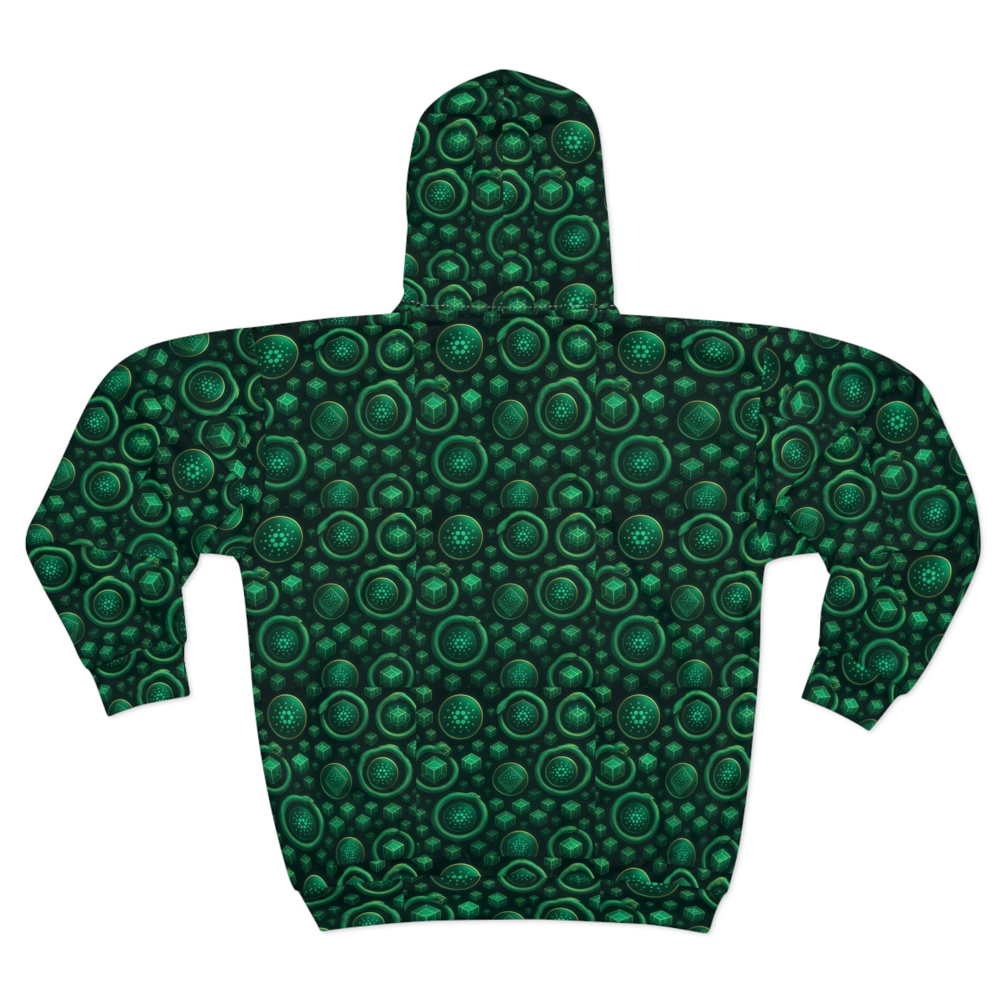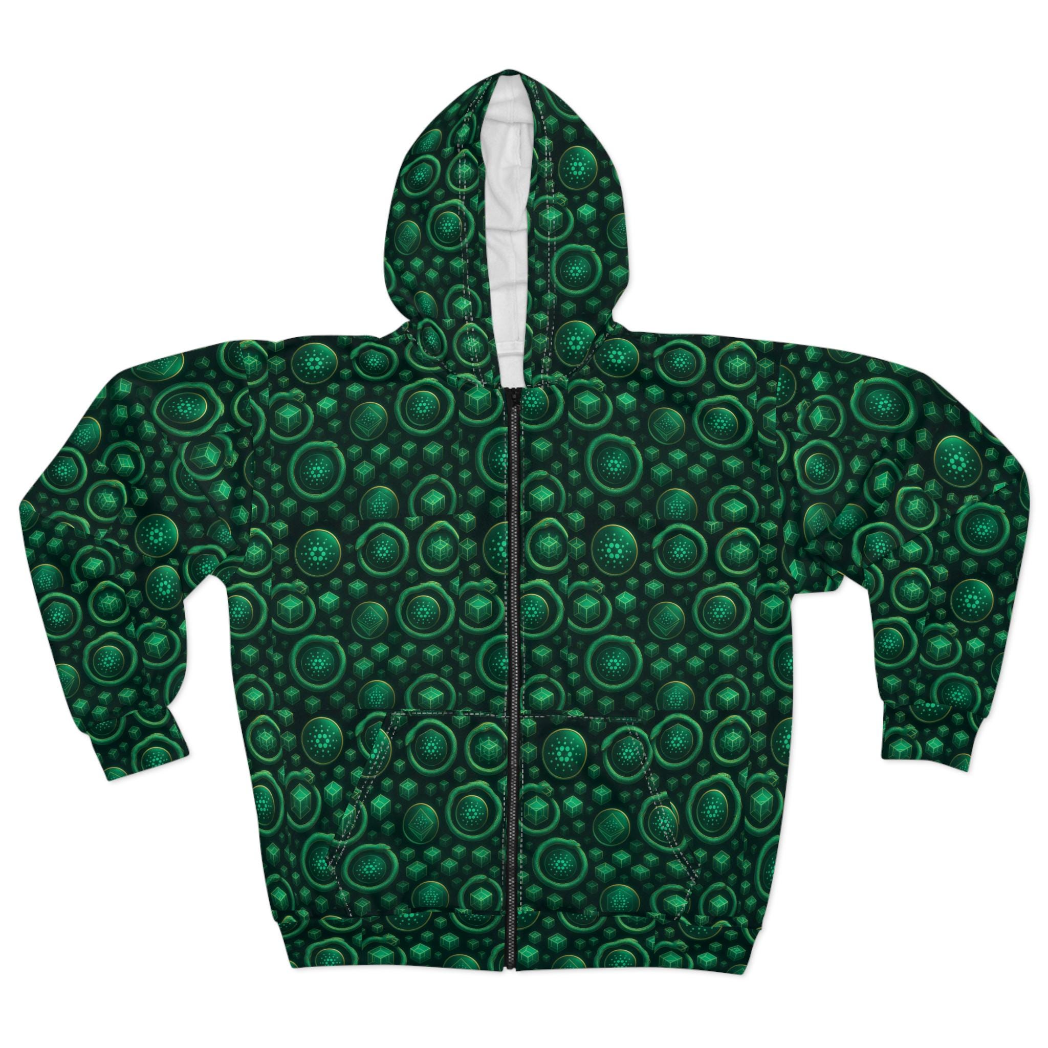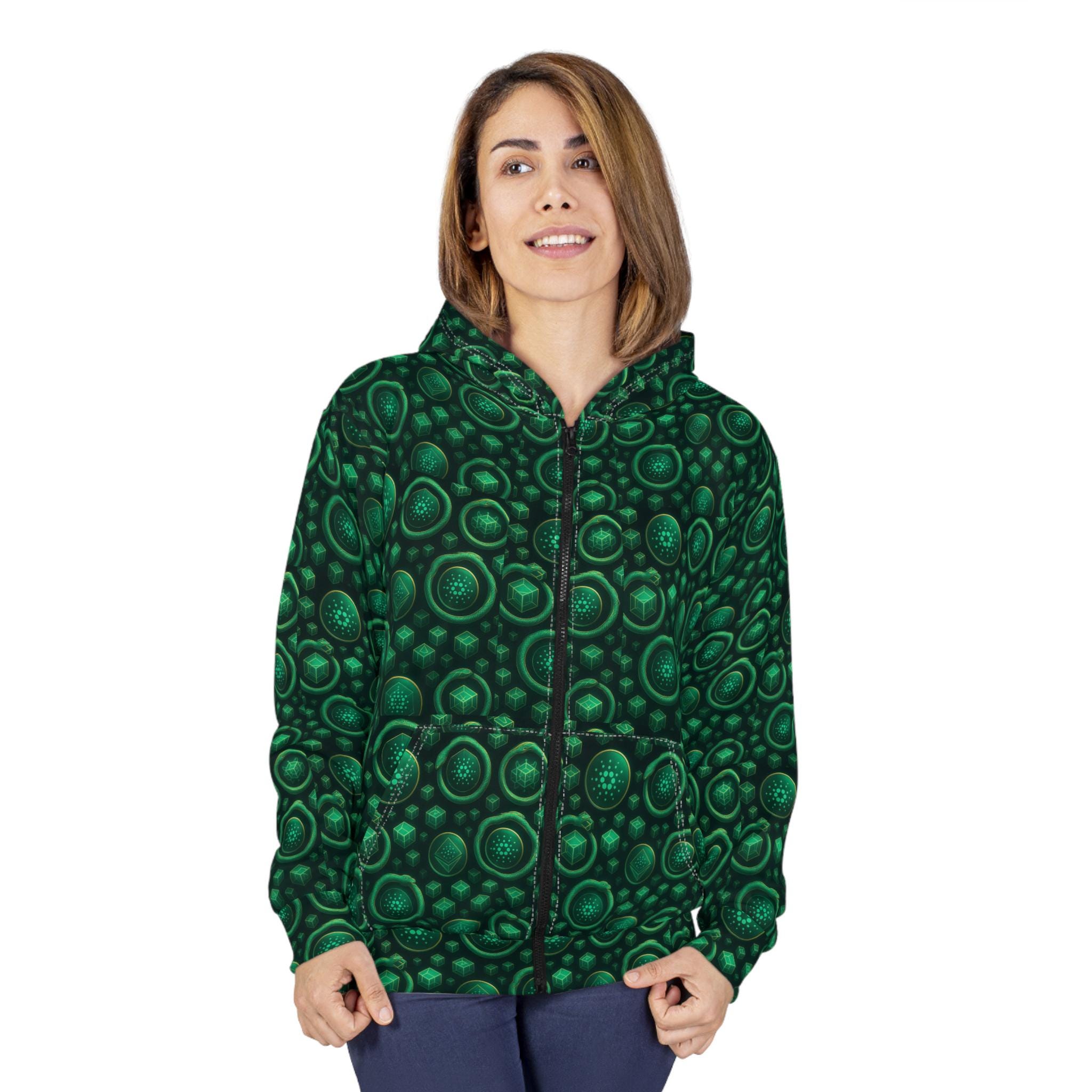 A bold, all-over print zip hoodie with ADA logos. Deep emerald circles Cardano logos across all the fabric. The roomy hood and front pockets make it easy to curl up with a book, walk a quiet trail, or layer over a tee for late-night gatherings. Medium-weight polyester keeps the shape and color vivid wash after wash, while the smooth inside and classic fit make it comfortable whether you’re commuting or camping in cooler weather. Thoughtful details — black zipper, white stitching, and custom cut-and-sewn construction — give it a handcrafted look that stands out in everyday life.