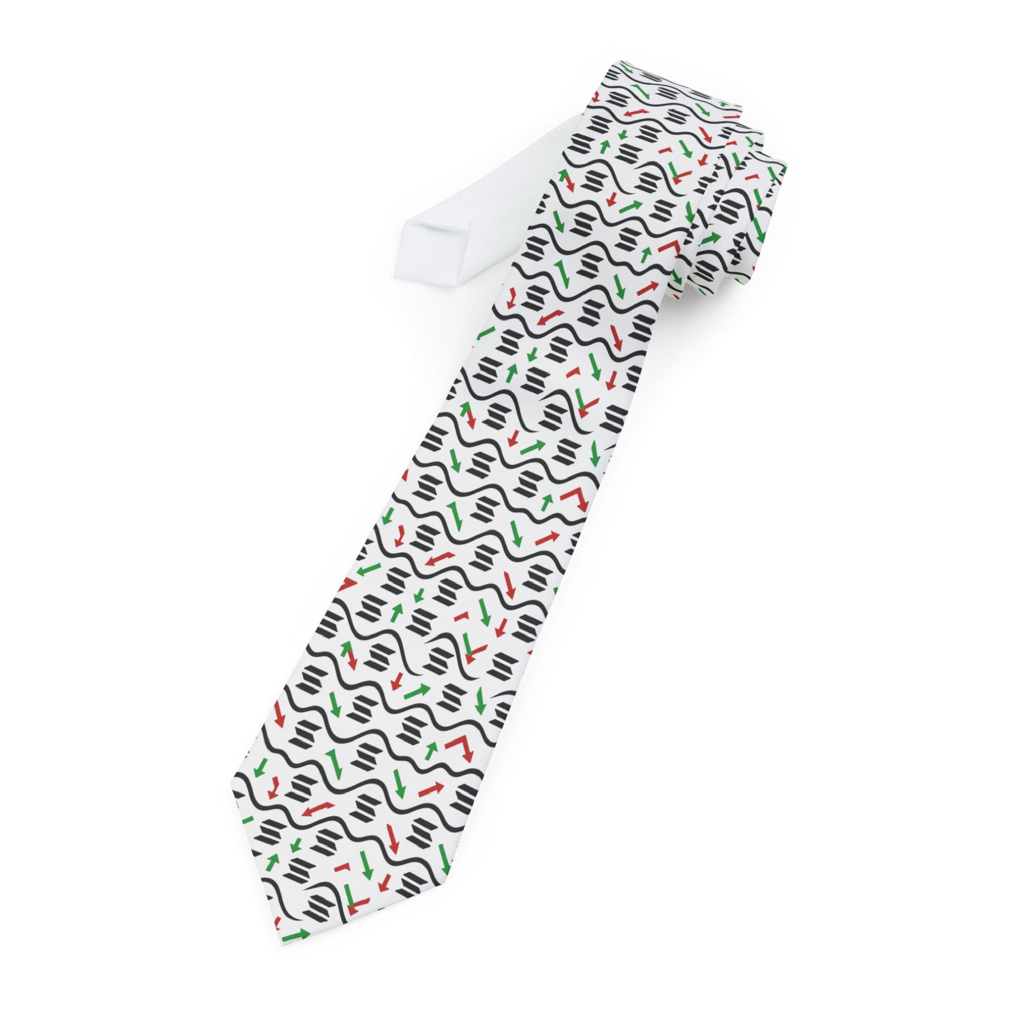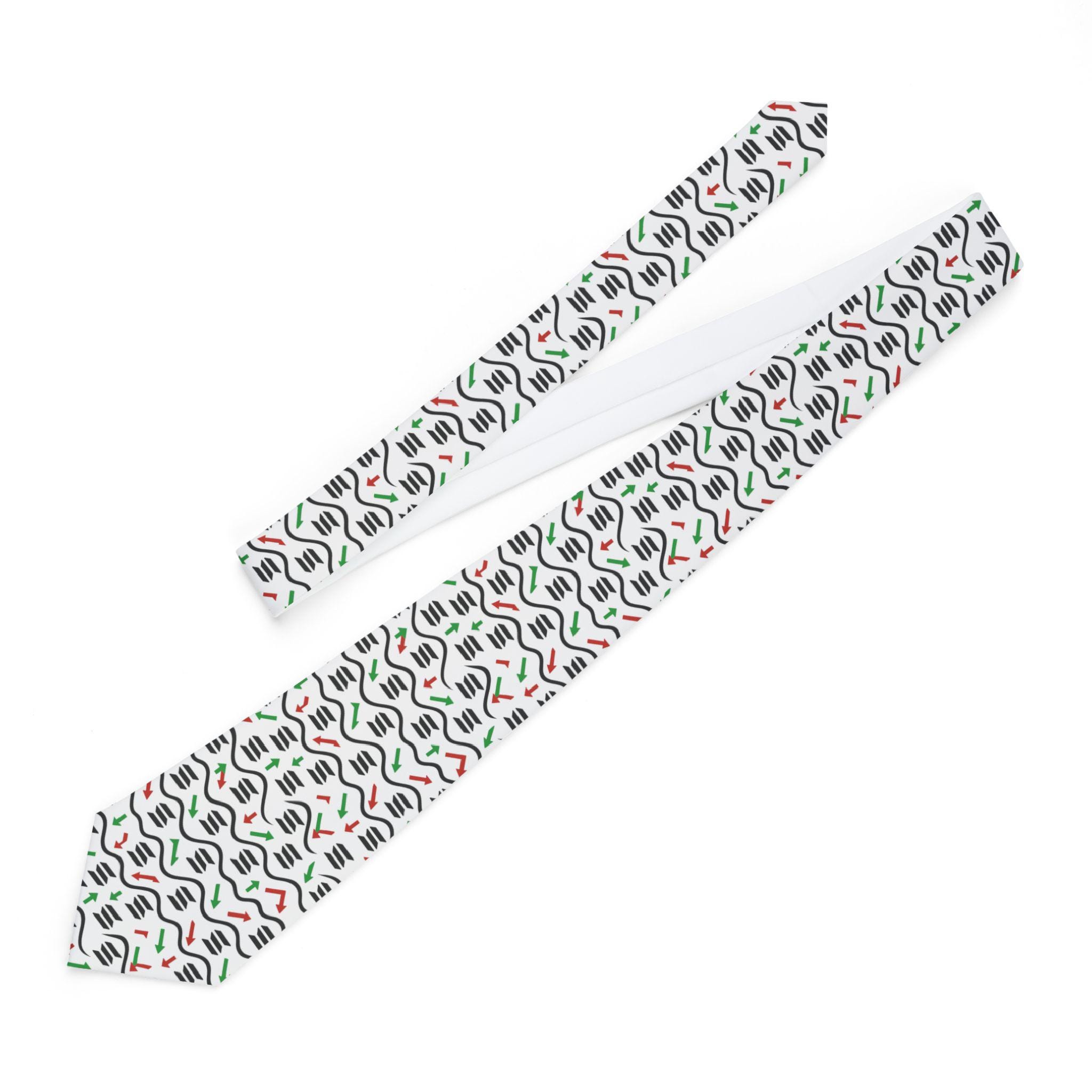 A slim, modern necktie that brings playful rhythm to wardrobe staples. Lightweight with a soft satin finish, the tie shows a repeating graphic of wavy black lines punctuated by small red and green accents on a clean white ground. It sits close to the neck, keeps its shape through the day, and slips neatly through the keeper loop so the tail stays hidden. Wear it to lift a simple dress shirt, add personality to semi-formal looks, or layer under a textured blazer for a fresh, artful touch.
