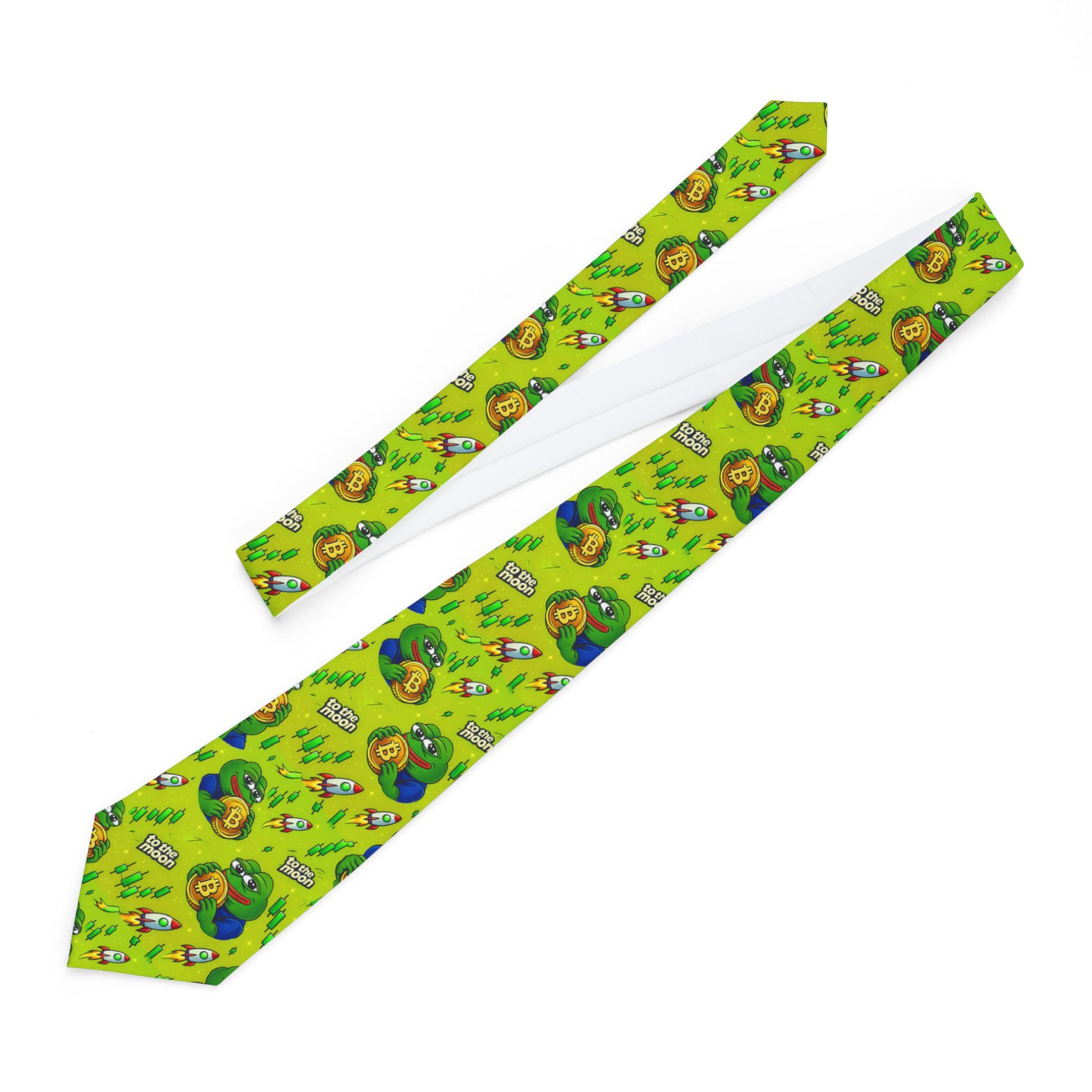 Cartoon Pepe holding Bitcoin Necktie | Green Sloth Tie, Tropical Leaves Print