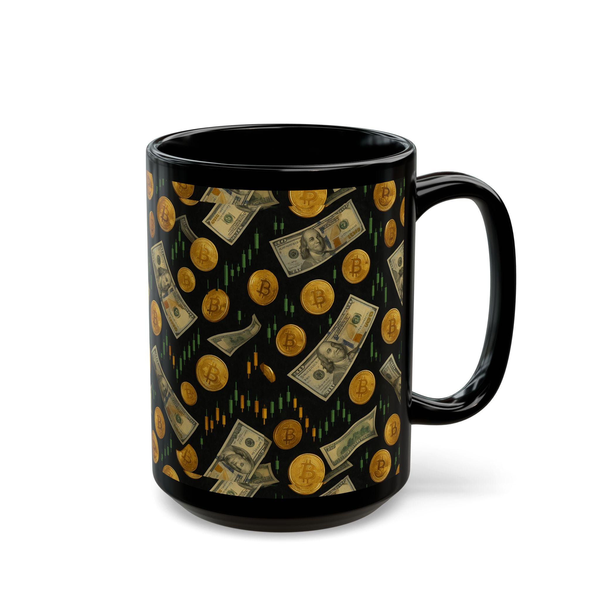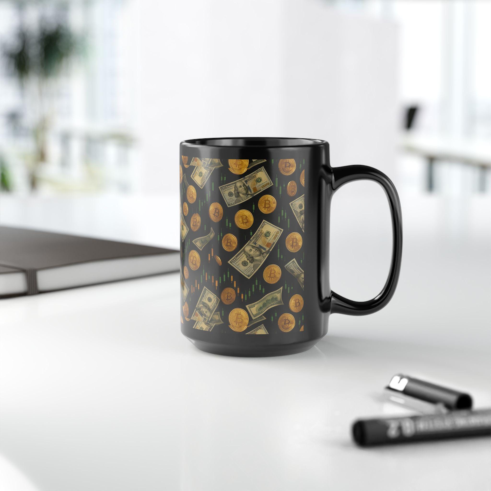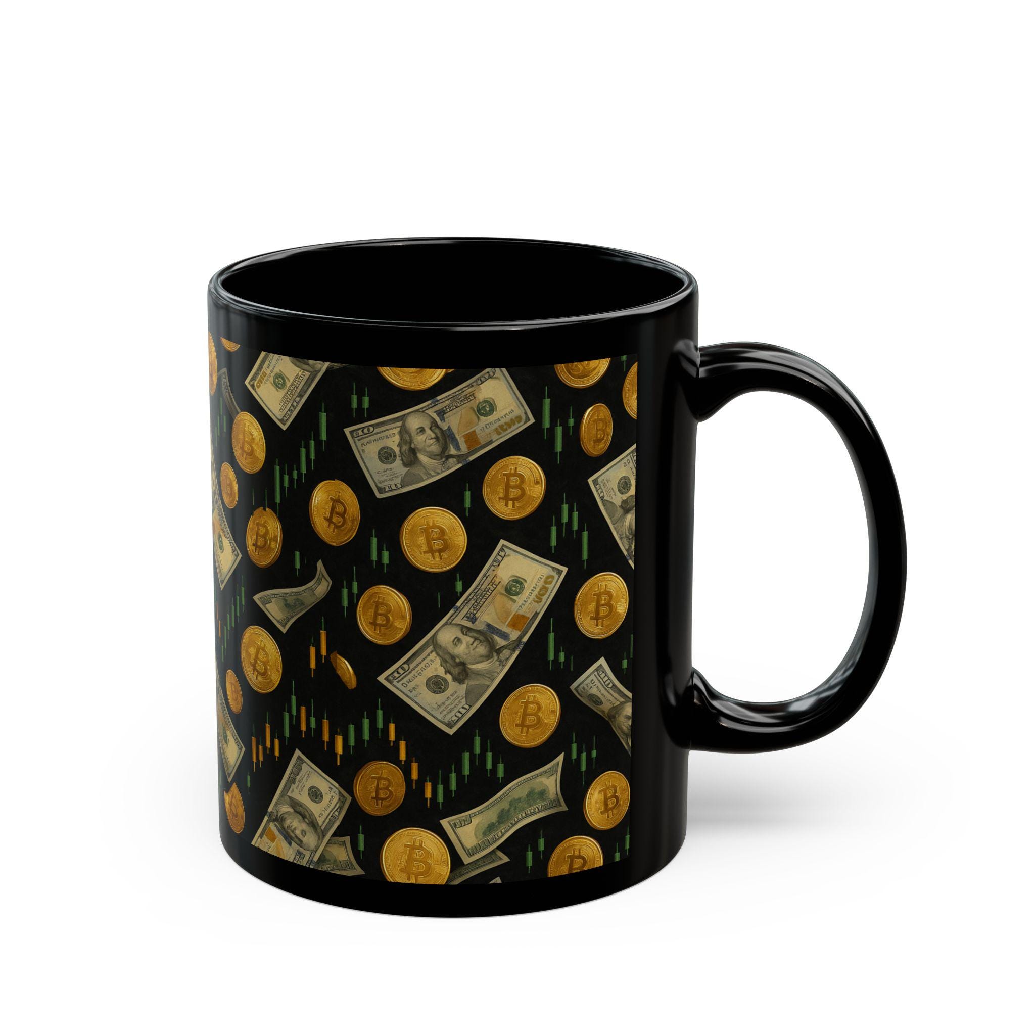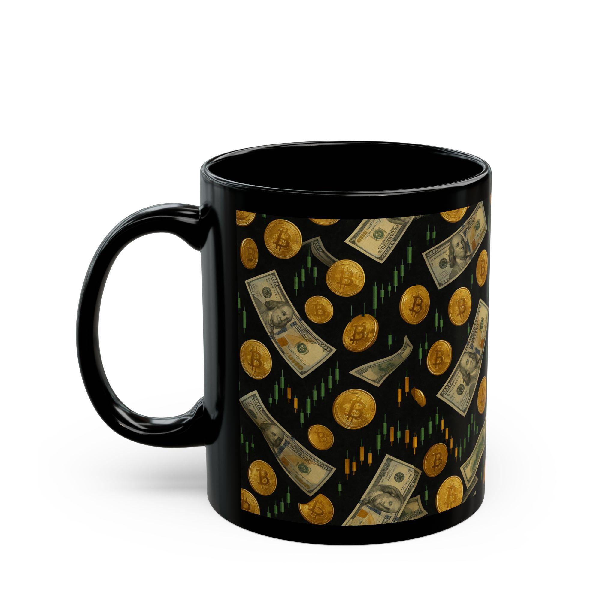 Start your day with a bold nod to the world of crypto and gains. This glossy black ceramic mug is wrapped in a rich, high-contrast pattern of gold coins, fluttering bills, and market candlesticks — a confident, slightly playful design that looks sharp on a cluttered desk or a neat kitchen counter. It feels weighty and smooth in the hand, and the deep black glaze makes the printed colors pop, turning every sip into a little reminder of ambition and hustle. Use it during morning charts, late-night planning sessions, or while celebrating a small victory — it blends into the routines of traders, crypto-curious friends, and anyone who enjoys finance-forward style.