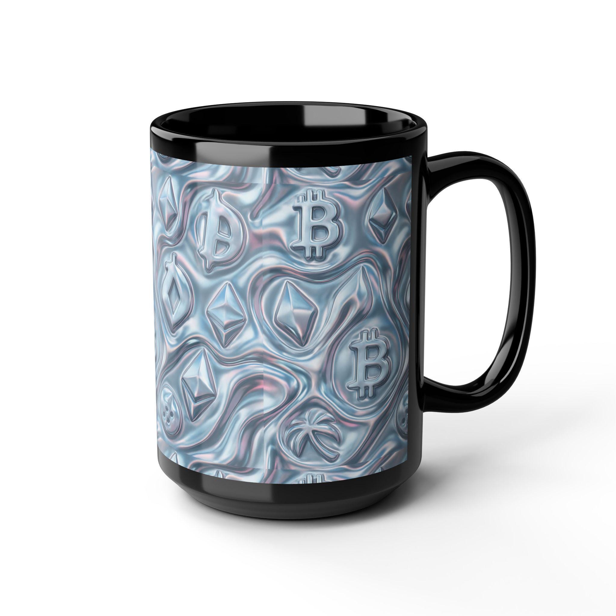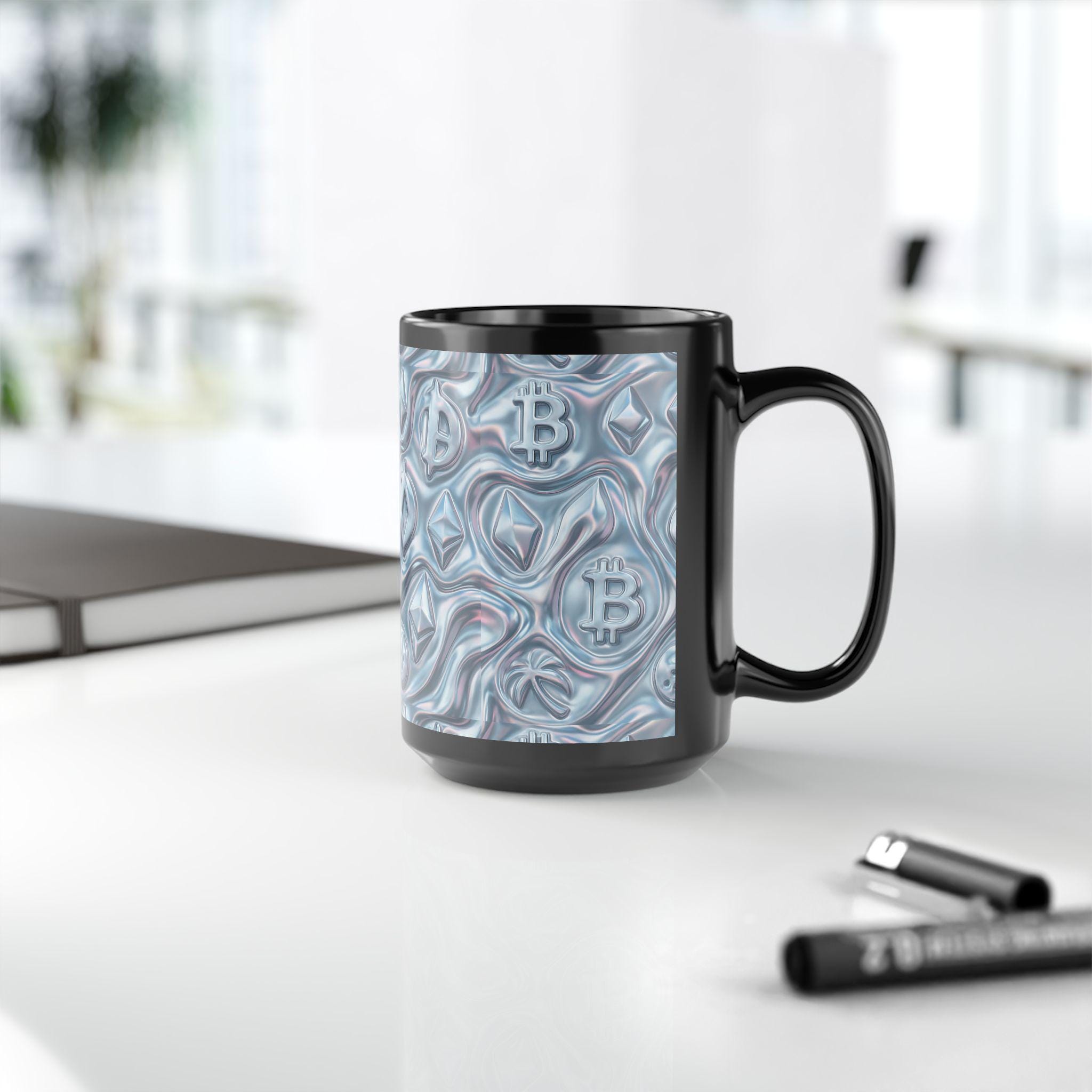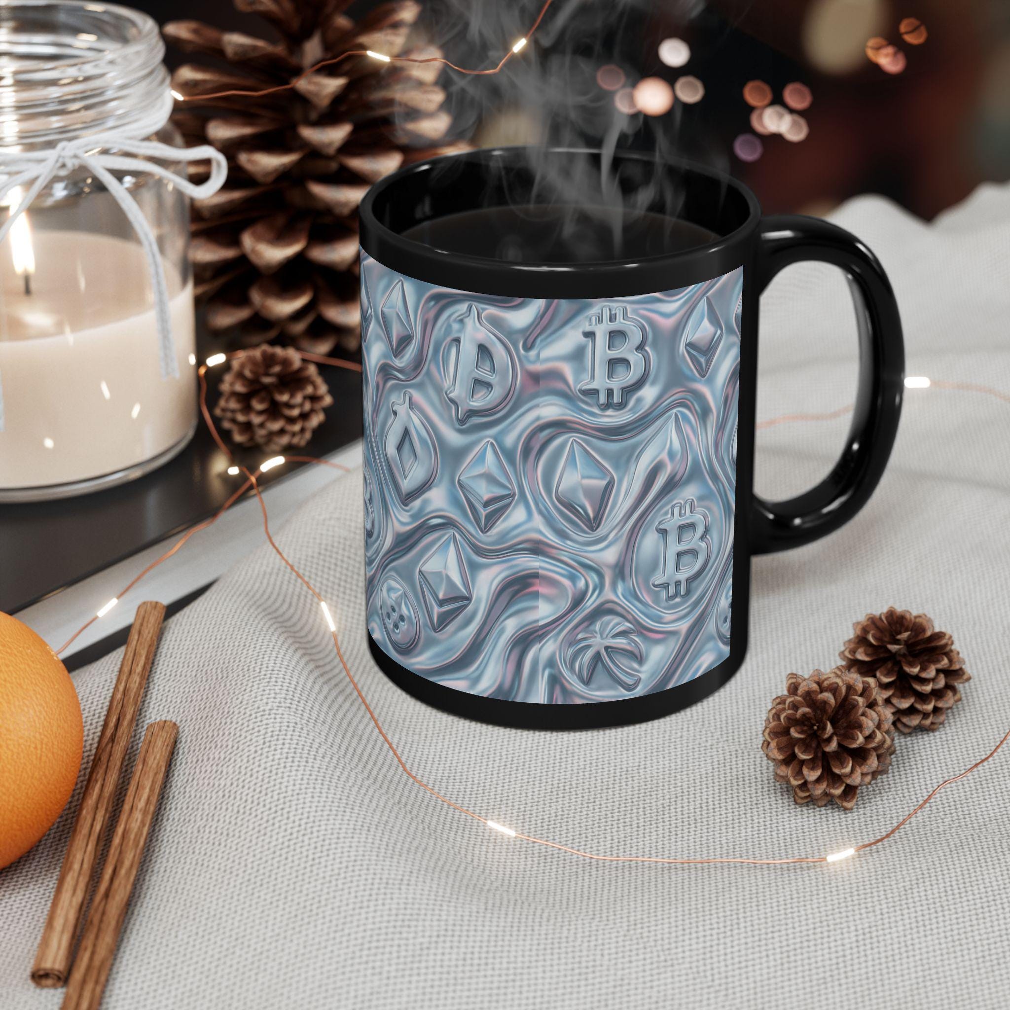 Sip your morning brew from a black ceramic mug that feels like a small piece of digital art. Swirling, pearlescent textures wrap around the mug with embossed cryptocurrency motifs — Bitcoin, Ethereum and other coin symbols — that catch light and invite a second look. The glossy black interior and handle frame the design, giving it a sleek, modern contrast that suits a desk, a studio, or a late-night coding session. It’s sturdy enough for everyday use, microwave-safe when you need to reheat coffee, and dishwasher-safe when you don’t want to think about cleanup. This mug fits into the routine of someone who lives at the intersection of tech and aesthetic — for morning energy, deep-focus sessions, or when you want a beverage vessel that signals what you care about.