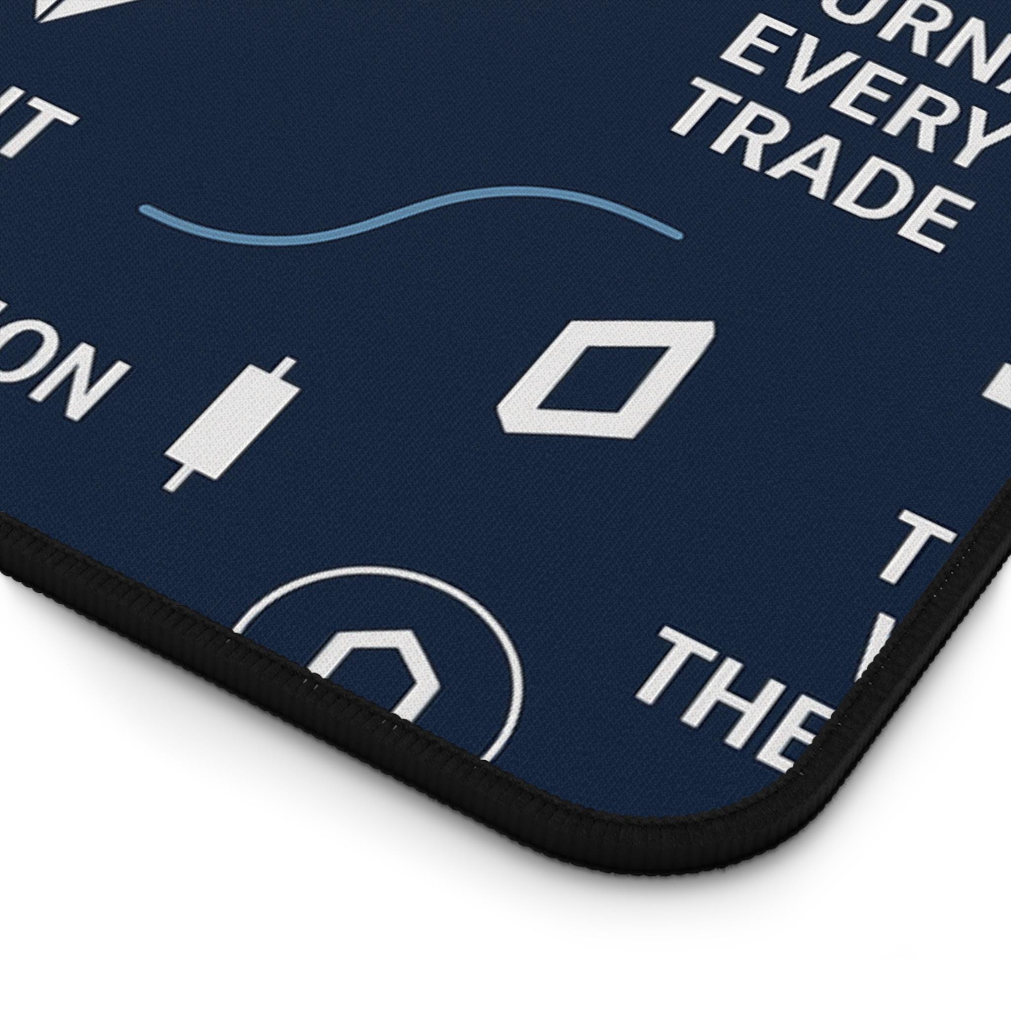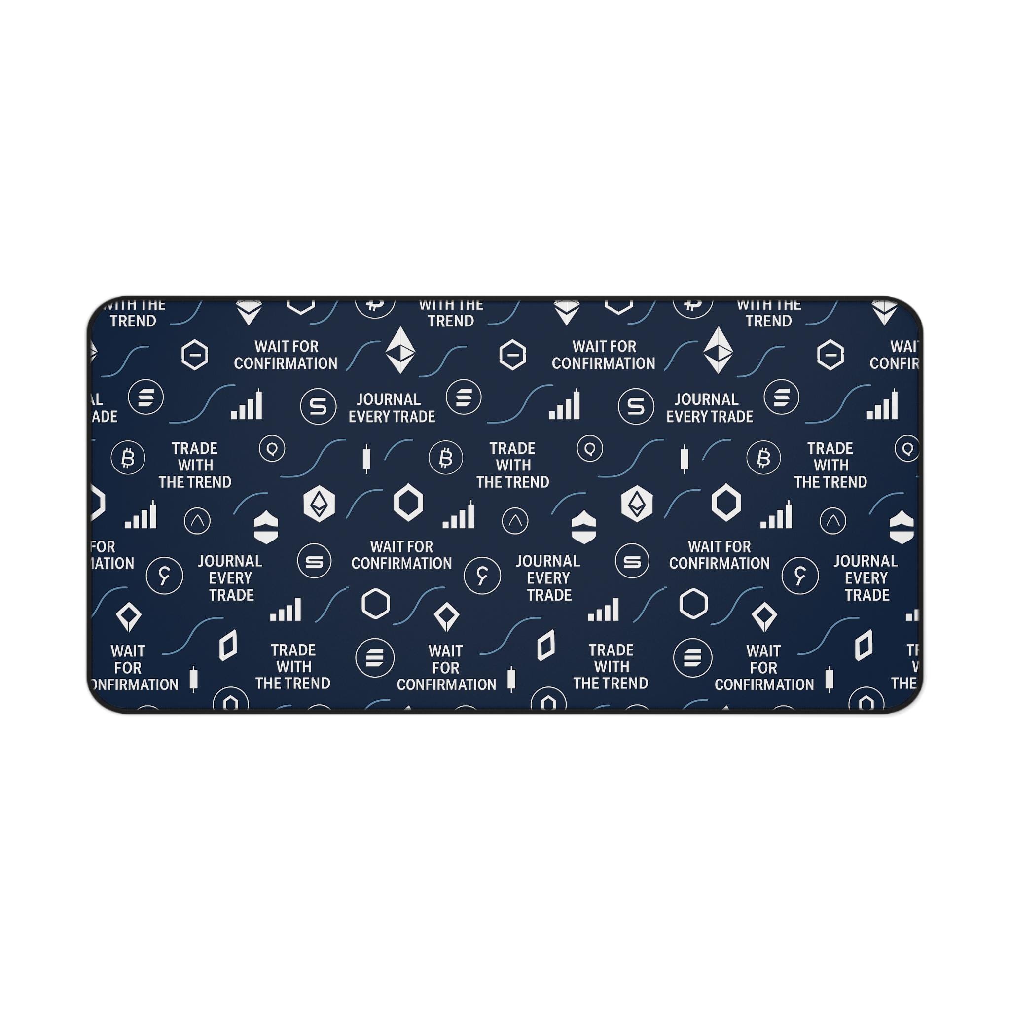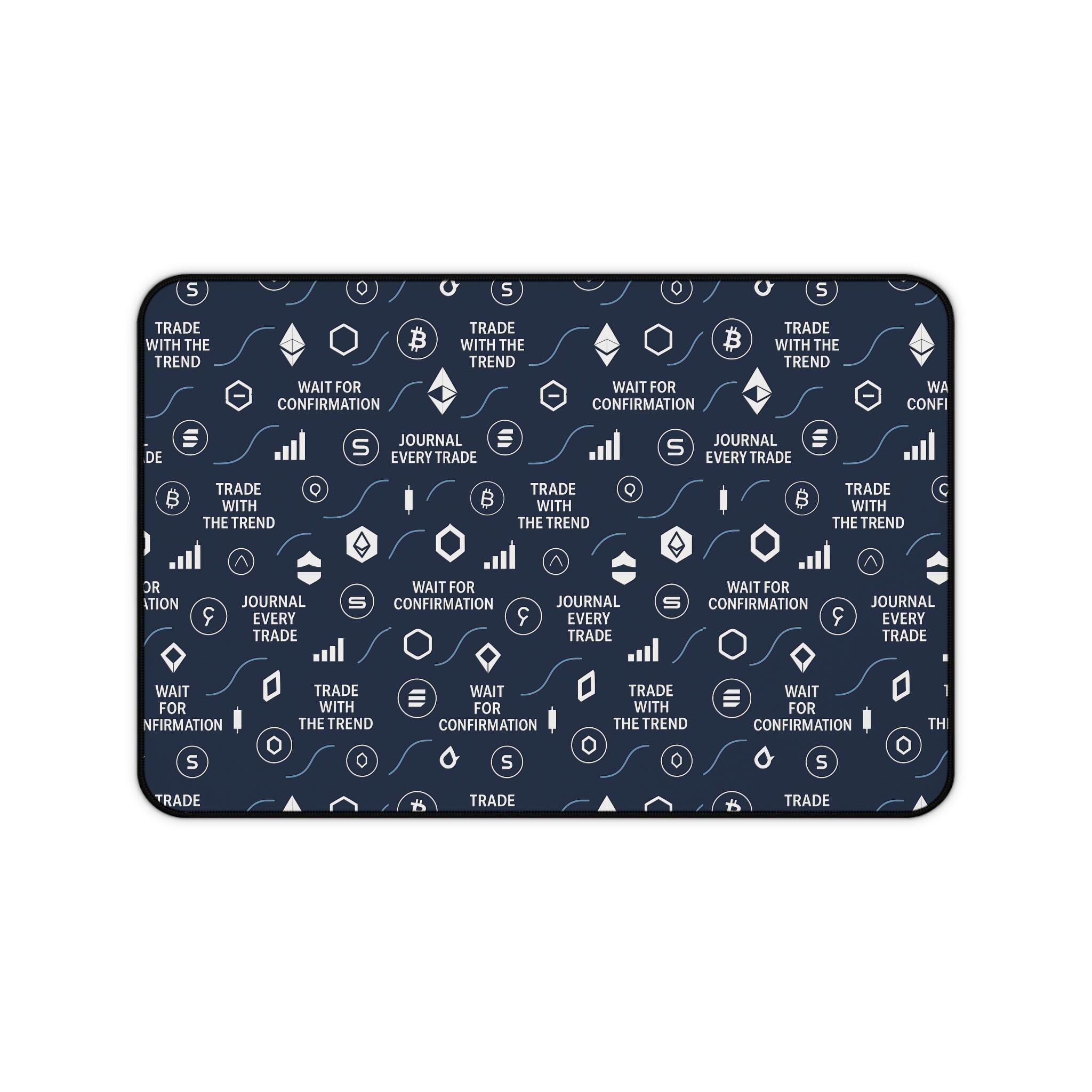 This neoprene desk mat brings focus and personality to any workspace. The deep navy design is patterned with small trading icons and motivational micro-text that reads like quiet reminders: chart peaks, candlesticks, and the words "wait for confirmation" and "journal every trade" weave together into a subtle, disciplined aesthetic. The soft yet supportive surface smooths mouse movement and keeps pens, notebooks, and keyboards grounded. Hemmed edges and vivid printing hold up to daily use, while the textured anti-slip backing ensures the mat stays put through long sessions. It’s crafted for traders, note-takers, and anyone who treats their desk like a strategy table—adding calm order and purpose to work or study routines.